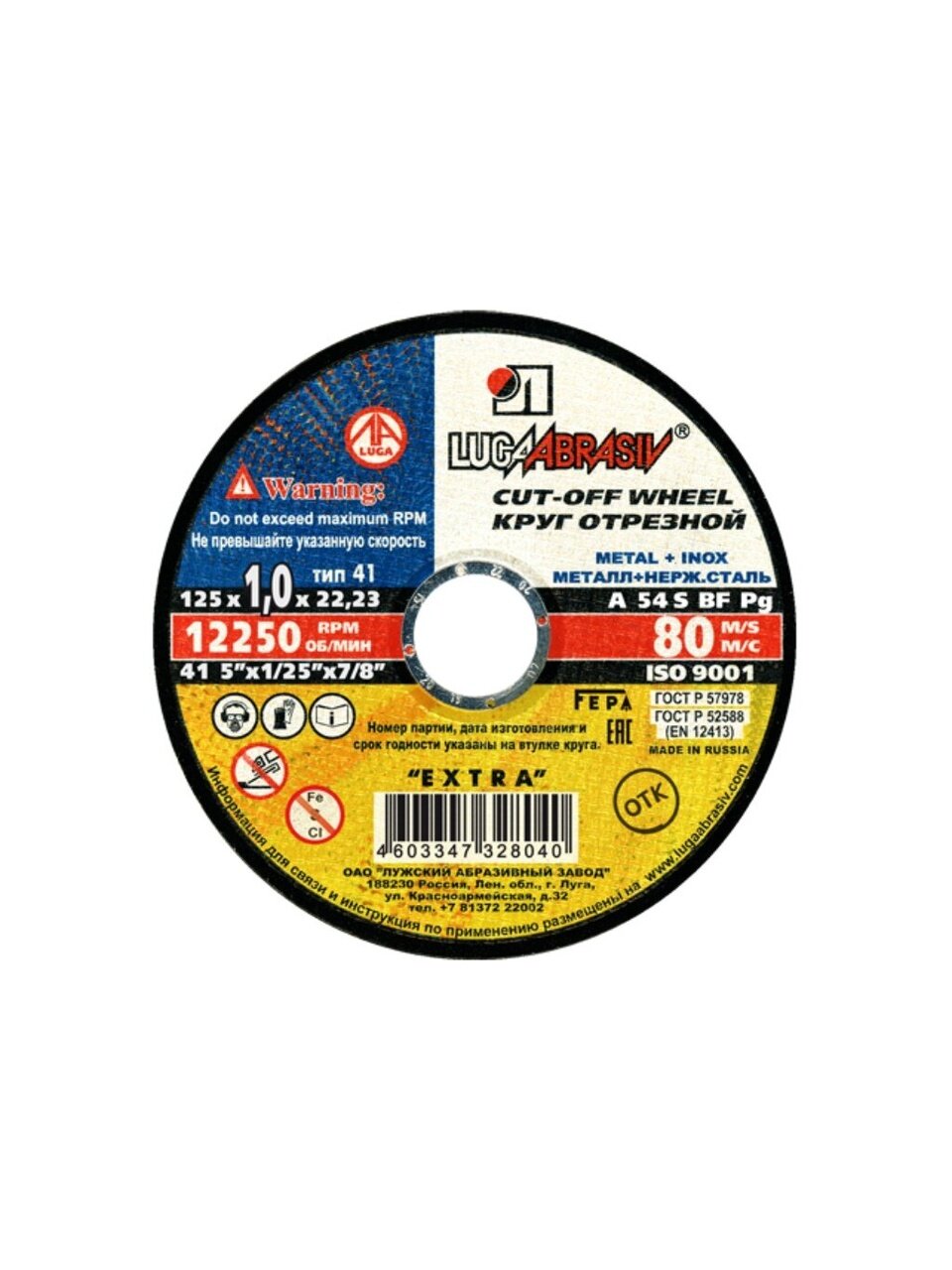 Вы можете приобрести «Круг отрезной по металлу, LugaAbrasiv, Extra, BF, диаметр 125х1 мм, посадочный диаметр 22.23 мм, зернистость A54, S, 400 шт» и другие товары в нашем интернет-магазине в Серпухове по низким ценам и с бесплатным самовывозом.