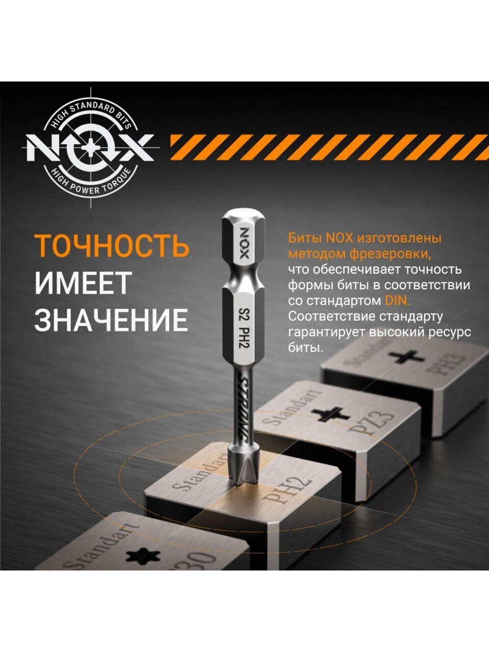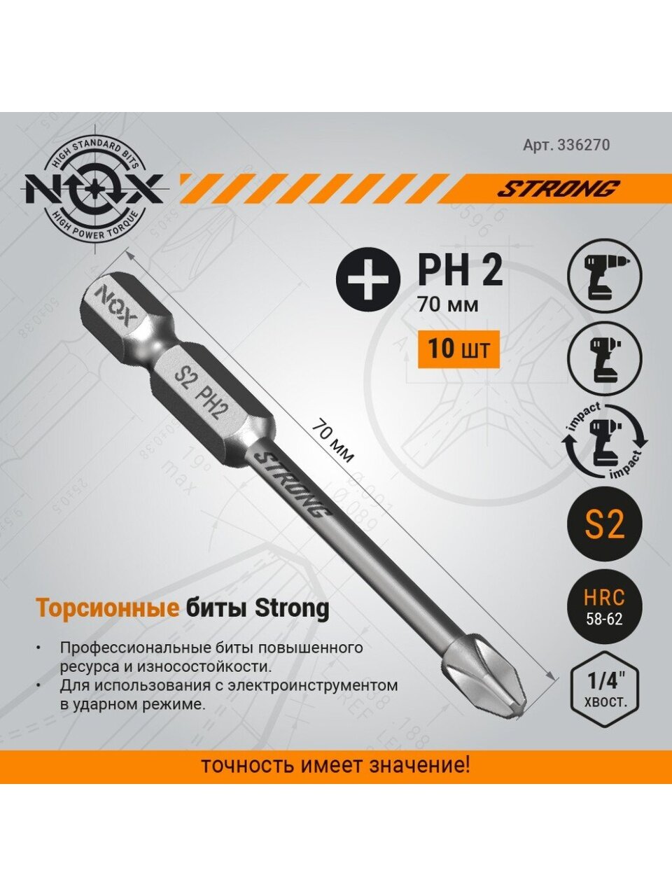 Бита Nox Strong предназначена для работы с шуруповертами при монтаже/демонтаже крепежа. Изготовлена из закаленной специальной комплексной-легированной стали марки S2. Биты имеют зону Torsion, позволяющую выдерживать большие нагрузки при кручении. Наличие торсионной поверхности позволяет эффективно распределять возникающее при работе давление. Это снимает чрезмерную нагрузку и повышает ударную прочность наконечника биты, что значительно увеличивает срок использования насадки.