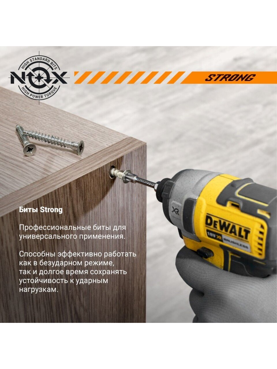 Бита Nox Strong предназначена для работы с шуруповертами при монтаже/демонтаже крепежа. Изготовлена из закаленной специальной комплексной-легированной стали марки S2. Биты имеют зону Torsion, позволяющую выдерживать большие нагрузки при кручении. Наличие торсионной поверхности позволяет эффективно распределять возникающее при работе давление. Это снимает чрезмерную нагрузку и повышает ударную прочность наконечника биты, что значительно увеличивает срок использования насадки.