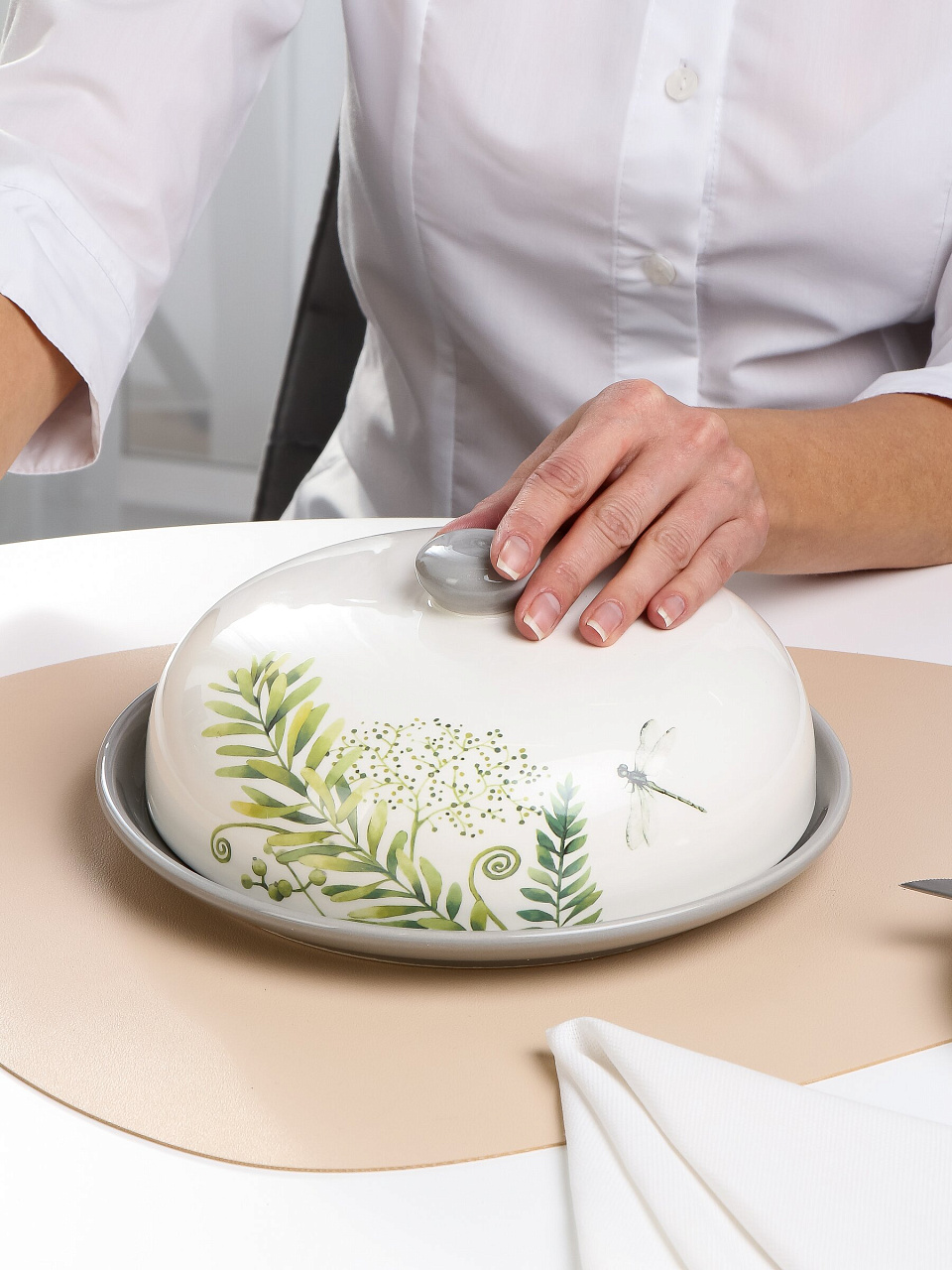 Блюдо выполнено из прочной керамики, комплектуется крышкой и имеет бортики для удобства хранения и подачи.