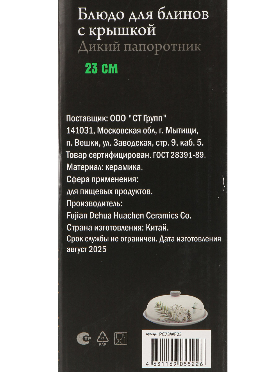 Диаметр блюда — 23 см, оно идеально для блинов, тортов, закусок и может использоваться как декоративное решение для сервировки.