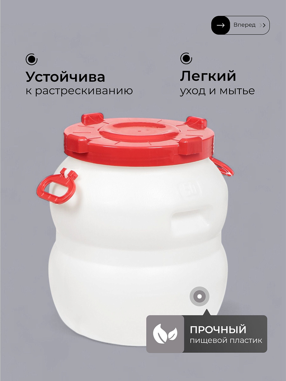 - Оптимальные параметры: объем 50 литров, диаметр горловины 330 мм, круглая форма, удобные ручки для переноски, безопасный пищевой пластик