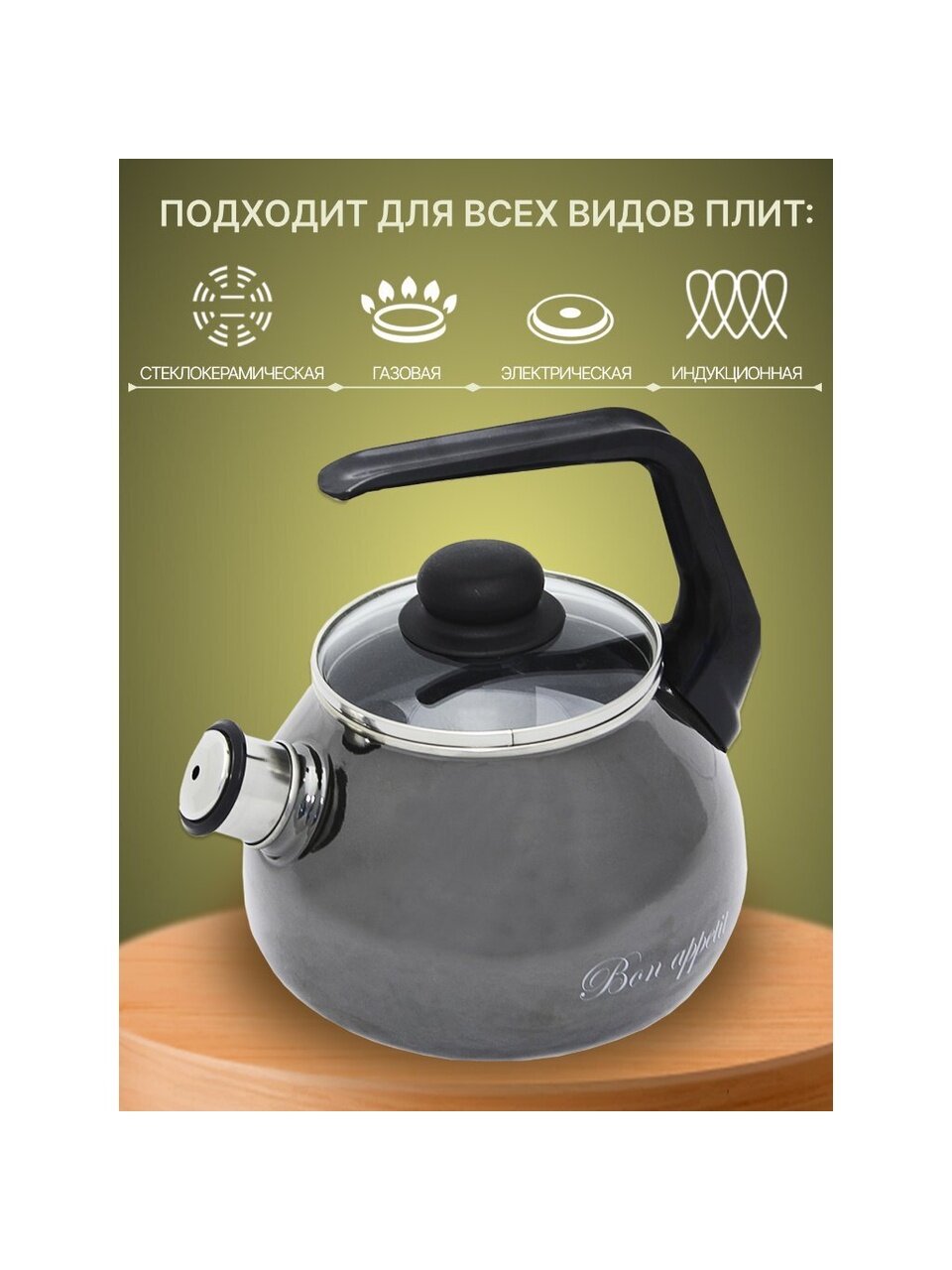 Вы можете приобрести «Чайник сталь, эмалированное покрытие, 3 л, со свистком, ручка консольная, Vitross, Bon Appetit, индукция, мокрый асфальт, 1RС12» и другие товары в нашем интернет-магазине в Твери по низким ценам и с бесплатным самовывозом.