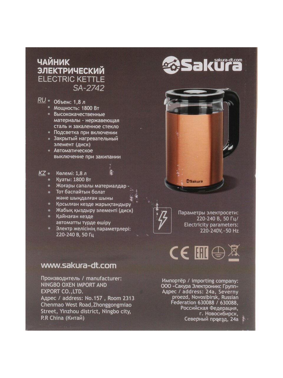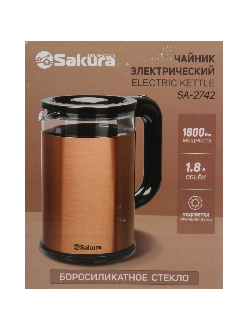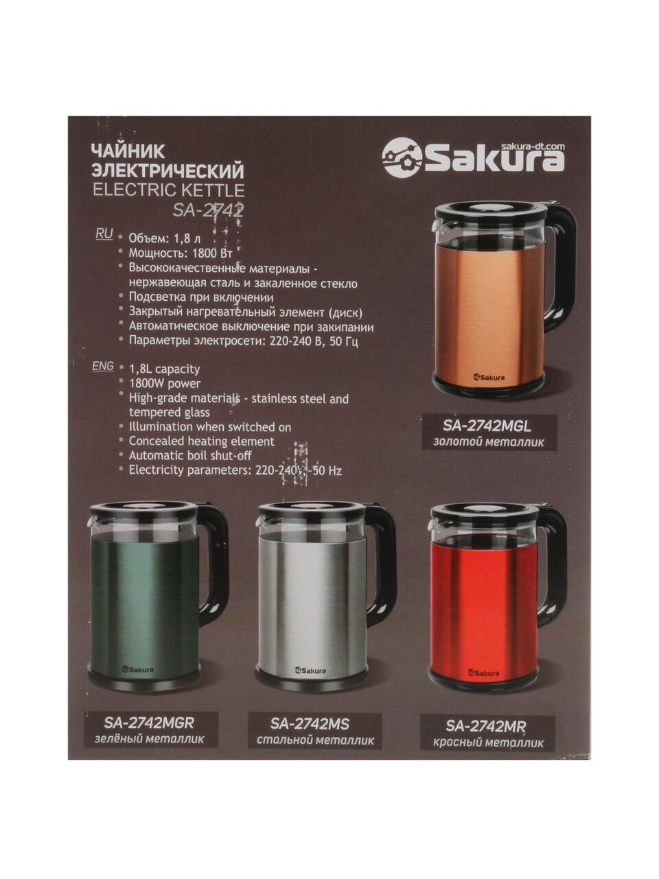 Чайник электрический Sakura SA-2742MGL 1.8 л — быстрое кипячение воды для дома и дачи, стильное стекло и нержавеющая сталь по выгодной цене.