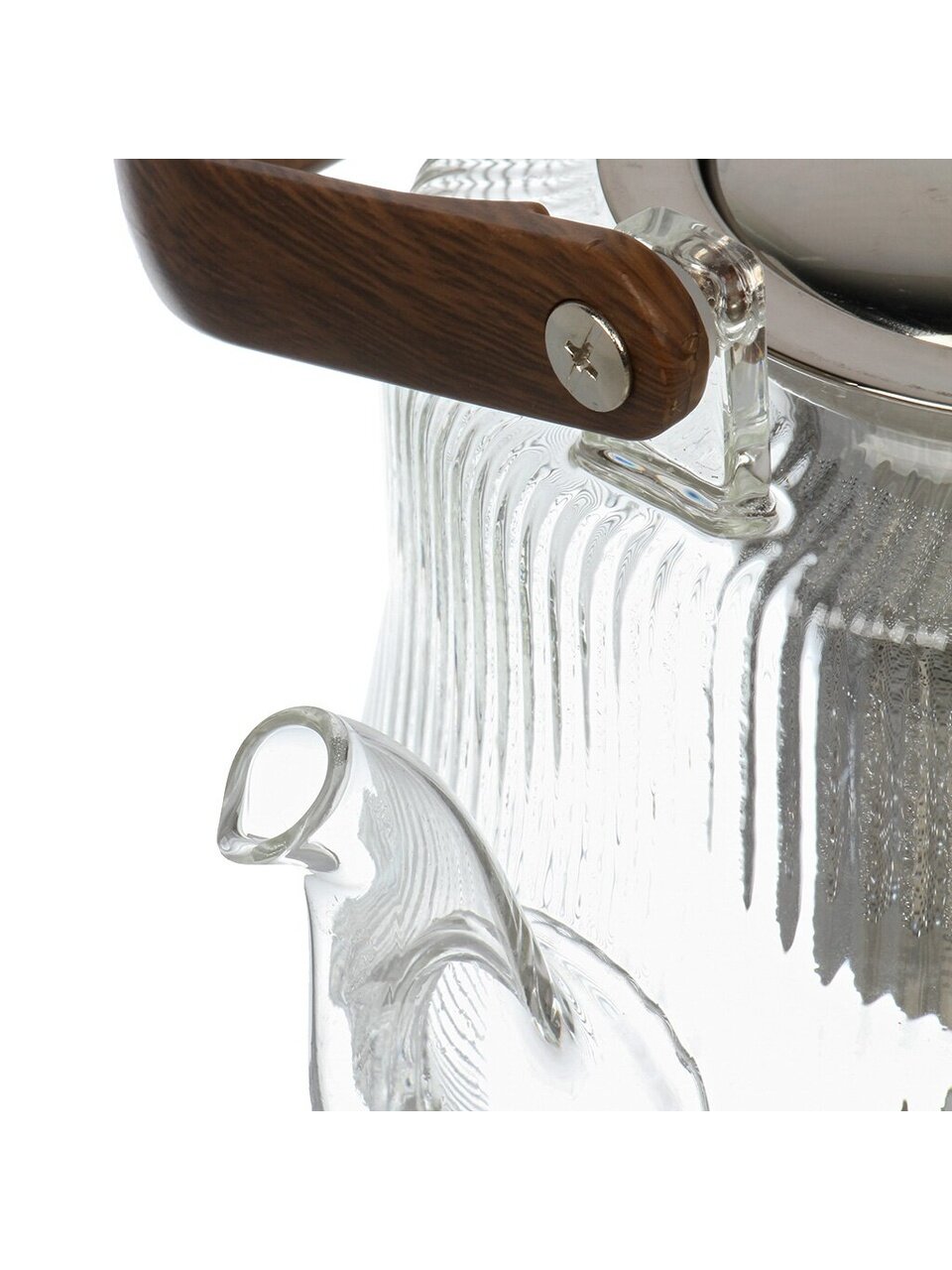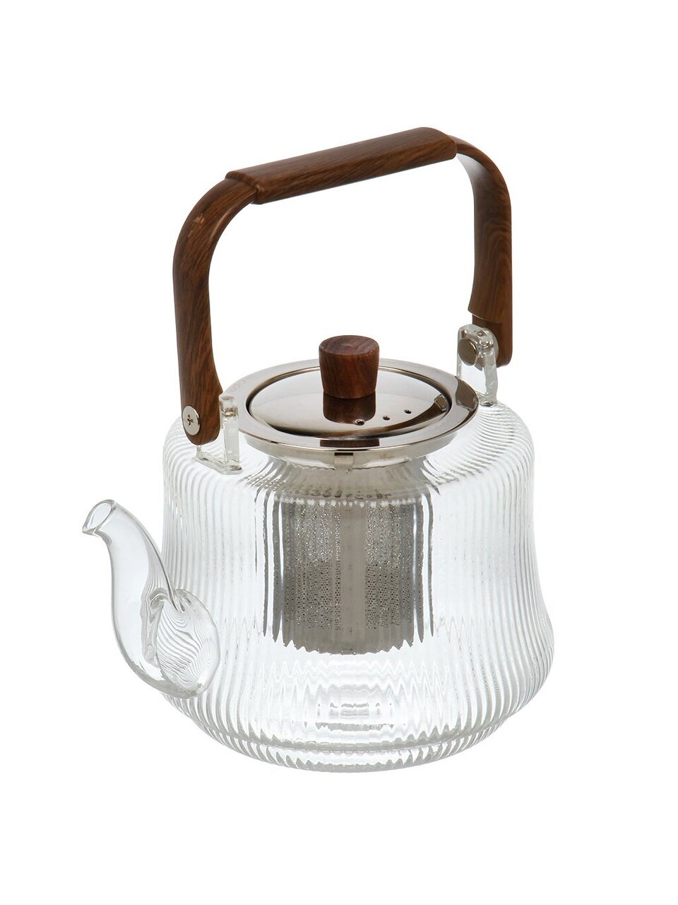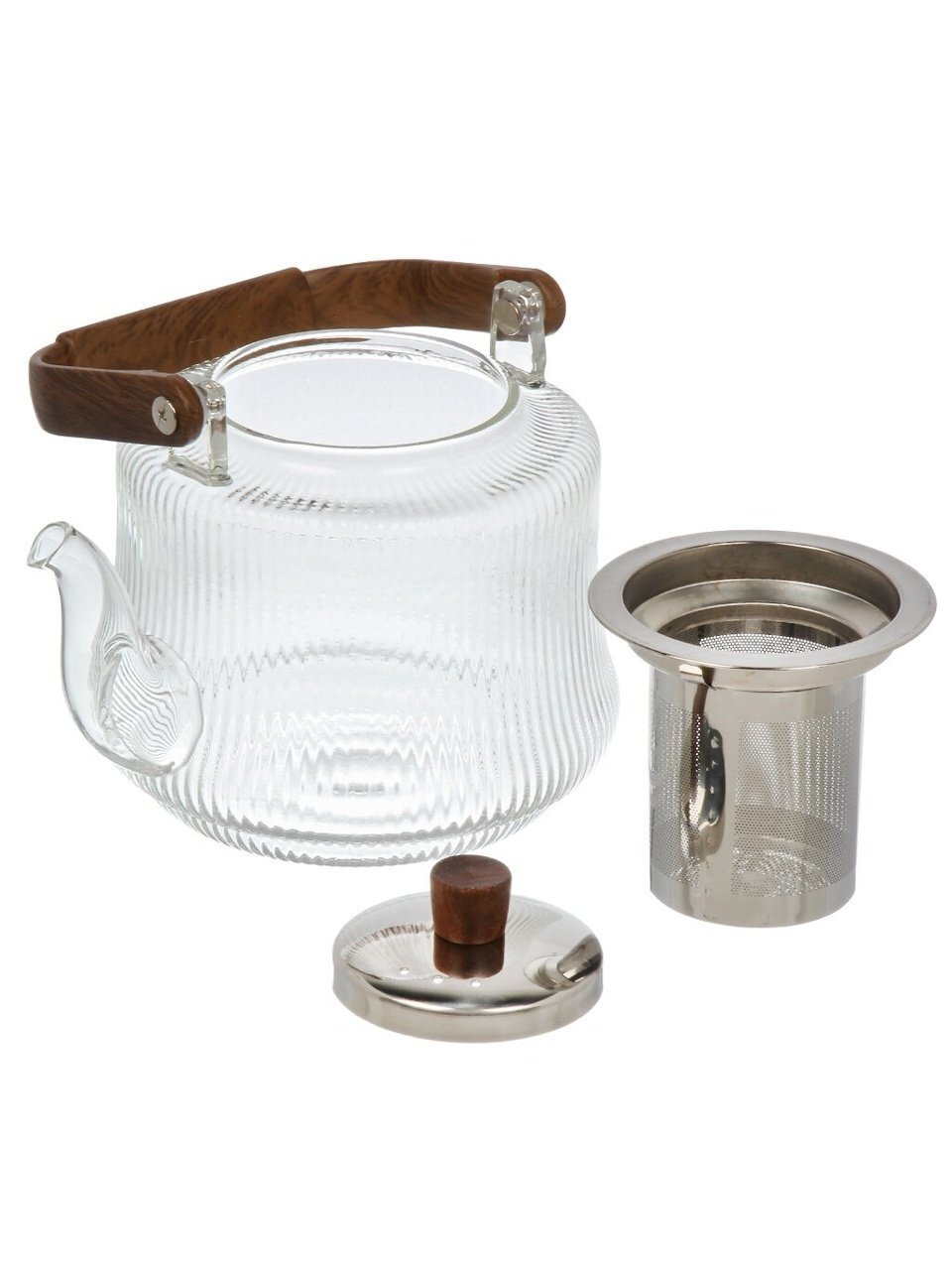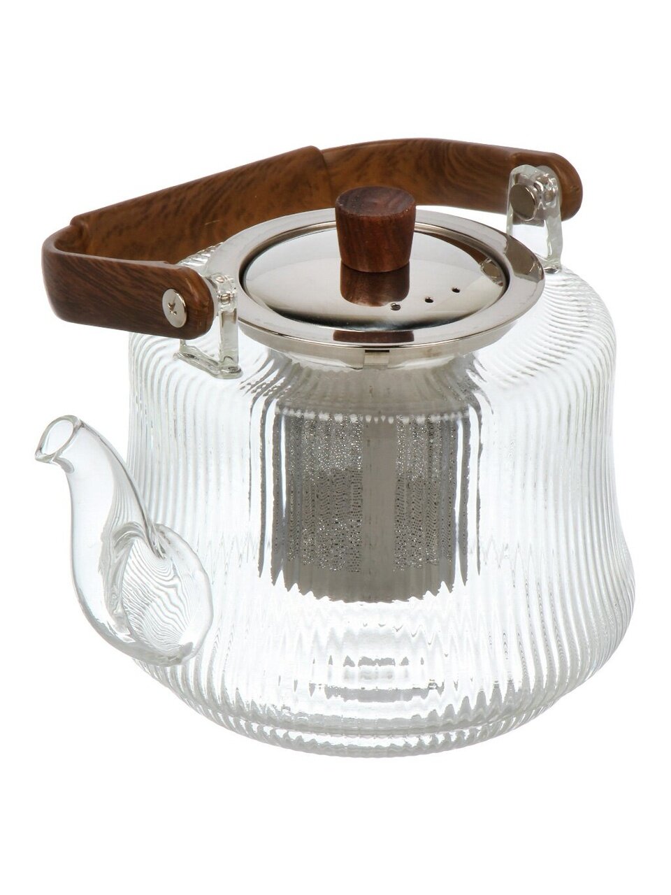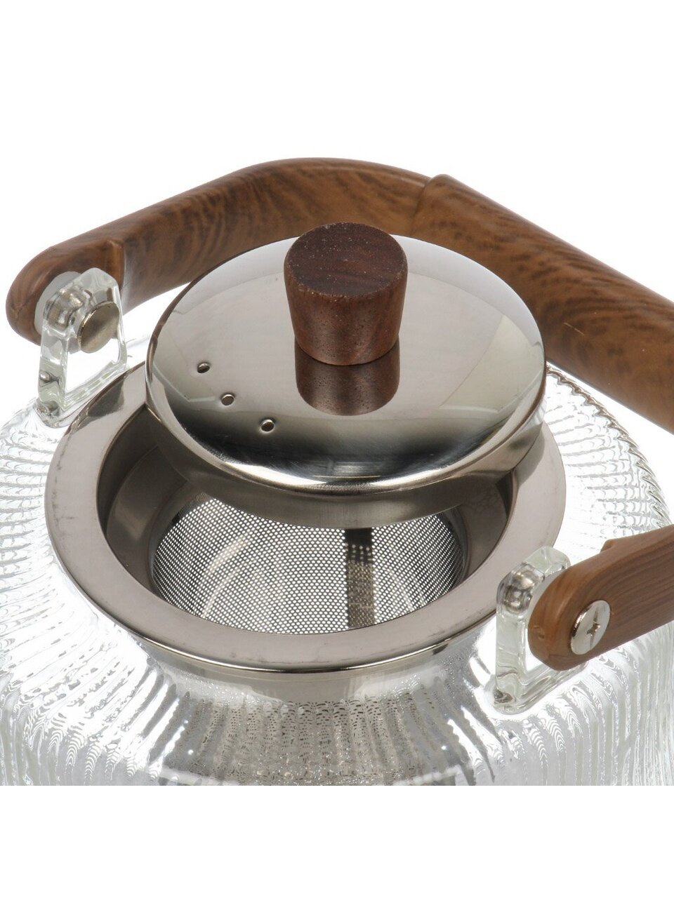 Стильный заварочный чайник 1,2 л из стекла с металлическим ситечком и деревянными элементами: идеальный выбор для дома, дачи и подарка — наслаждайтесь вкусом чая без осадка.