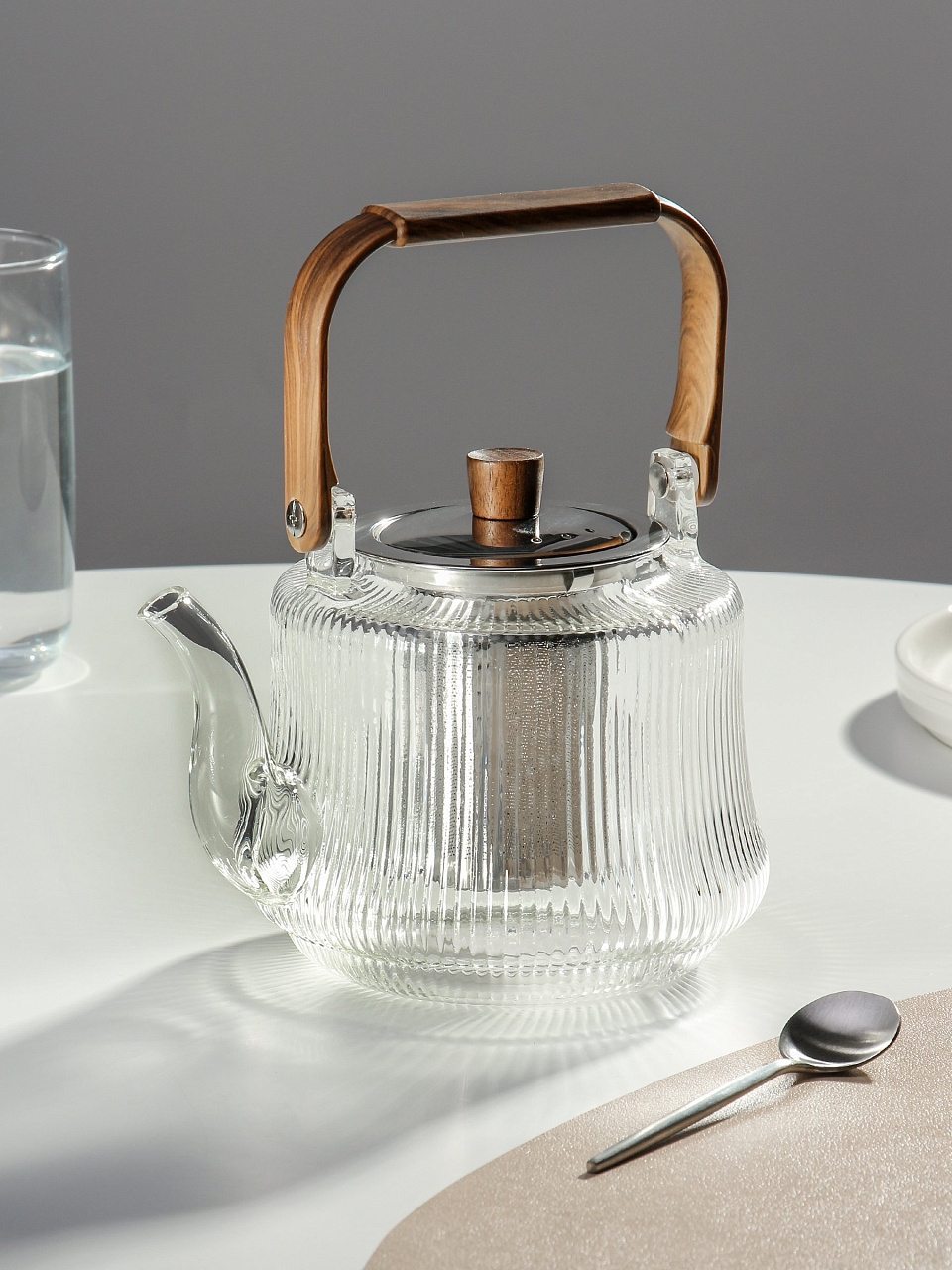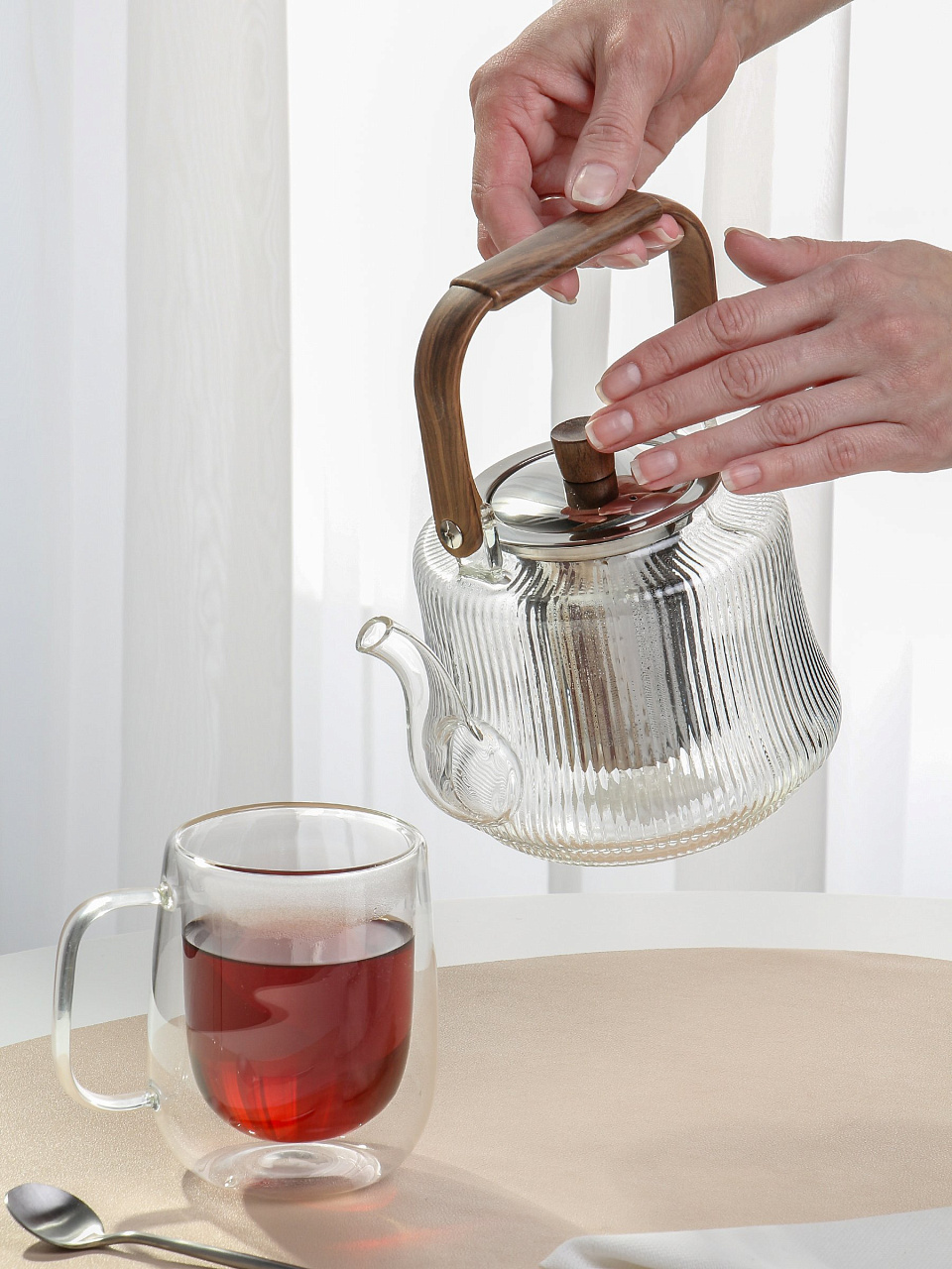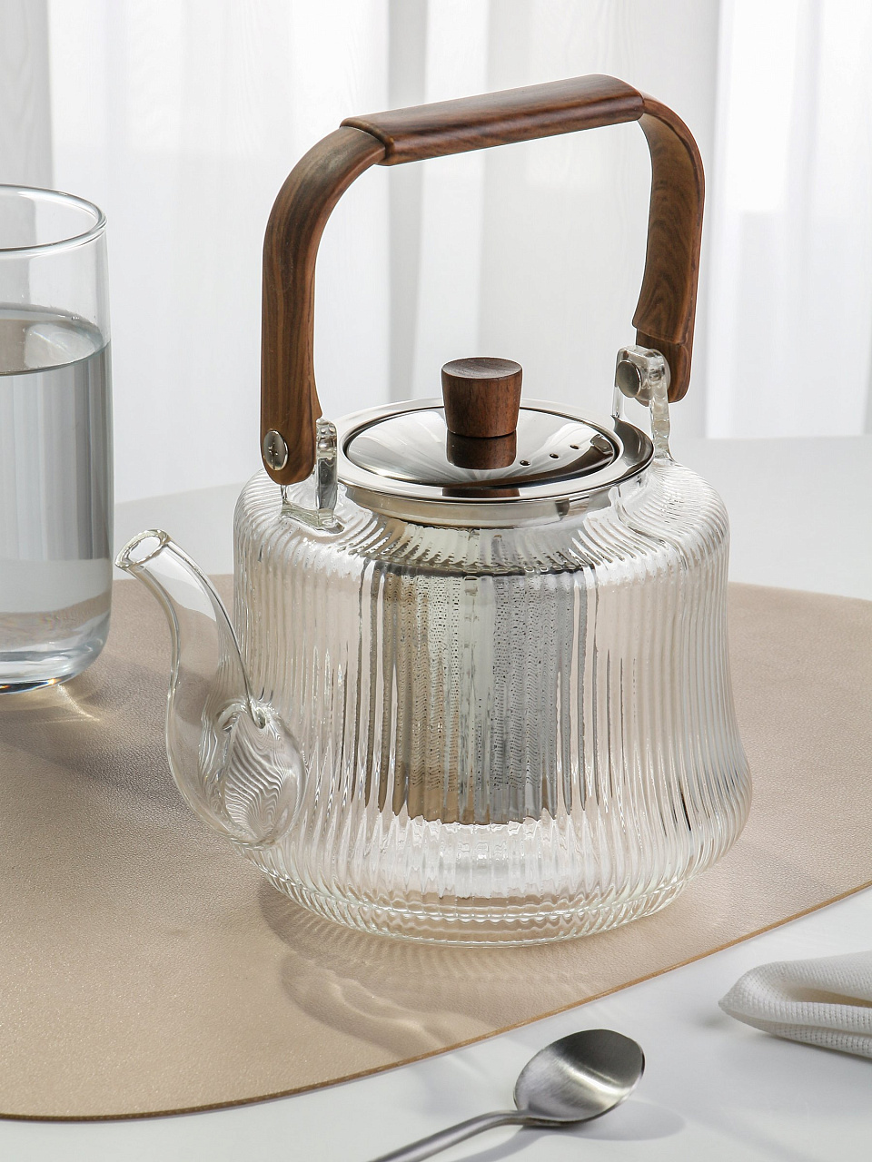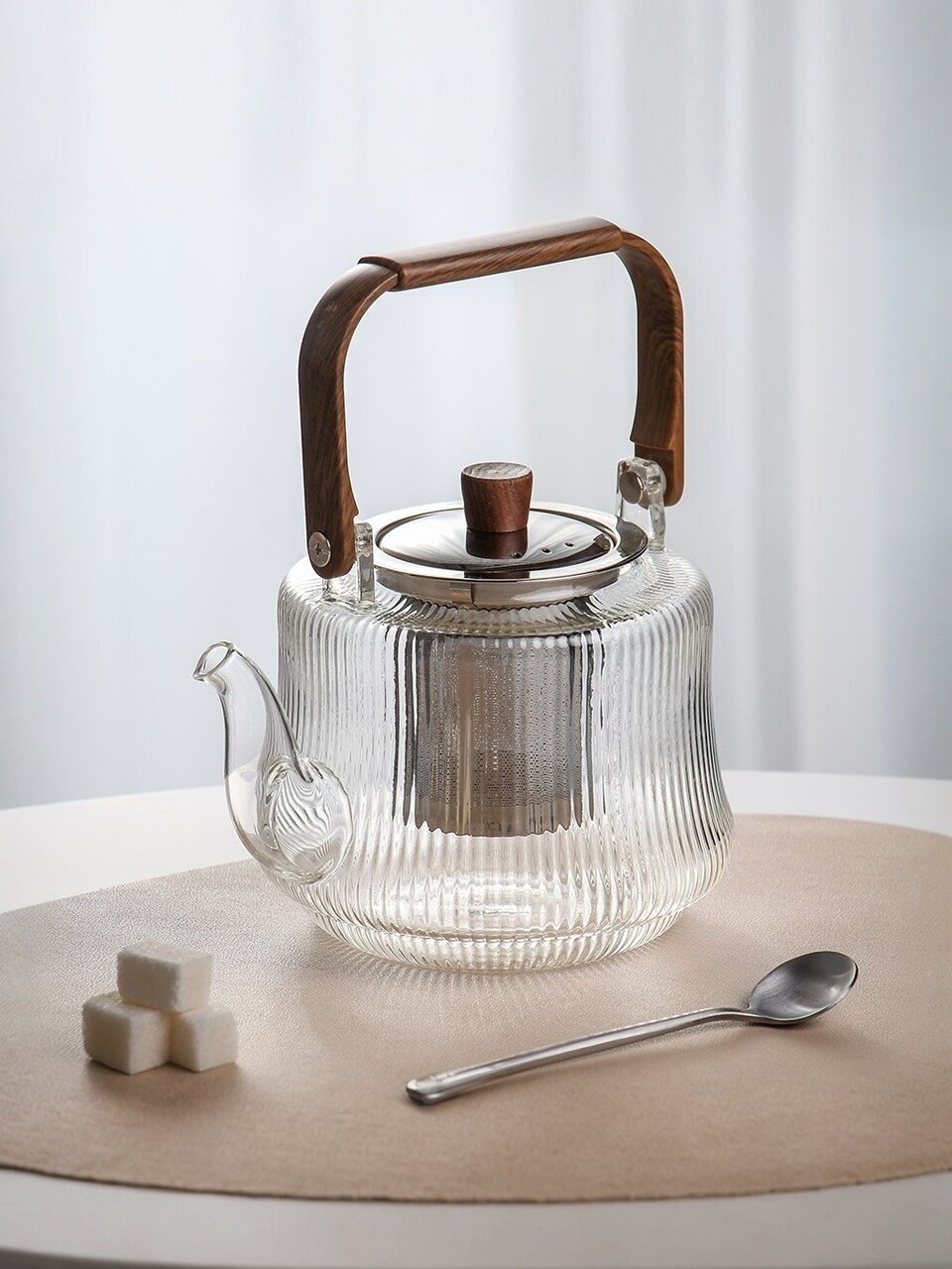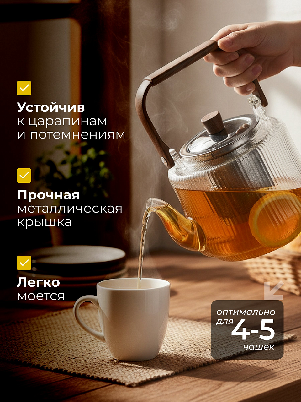 Чем отличается этот чайник от стандартных моделей? Здесь используется жаропрочное стекло, устойчивое к перепадам температур, и эргономичная ручка из бука с влагозащитной пропиткой. Это решение для ценителей натуральных материалов и тех, кто спрашивает: «подойдет ли чайник для заваривания травяных сборов?» — да, благодаря универсальному ситечку и объему. В отличие от пластиковых аналогов, стекло не влияет на вкус напитка, а деревянные элементы добавляют уюта интерьеру.