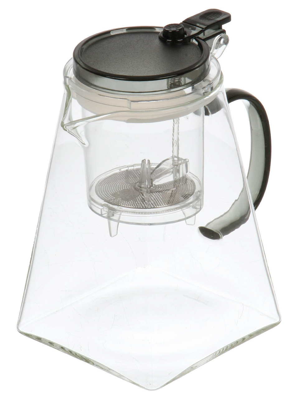 Чайник рассчитан на 0.95 литра, выполнен из термостойкого стекла с металлическим ситечком из нержавеющей стали.