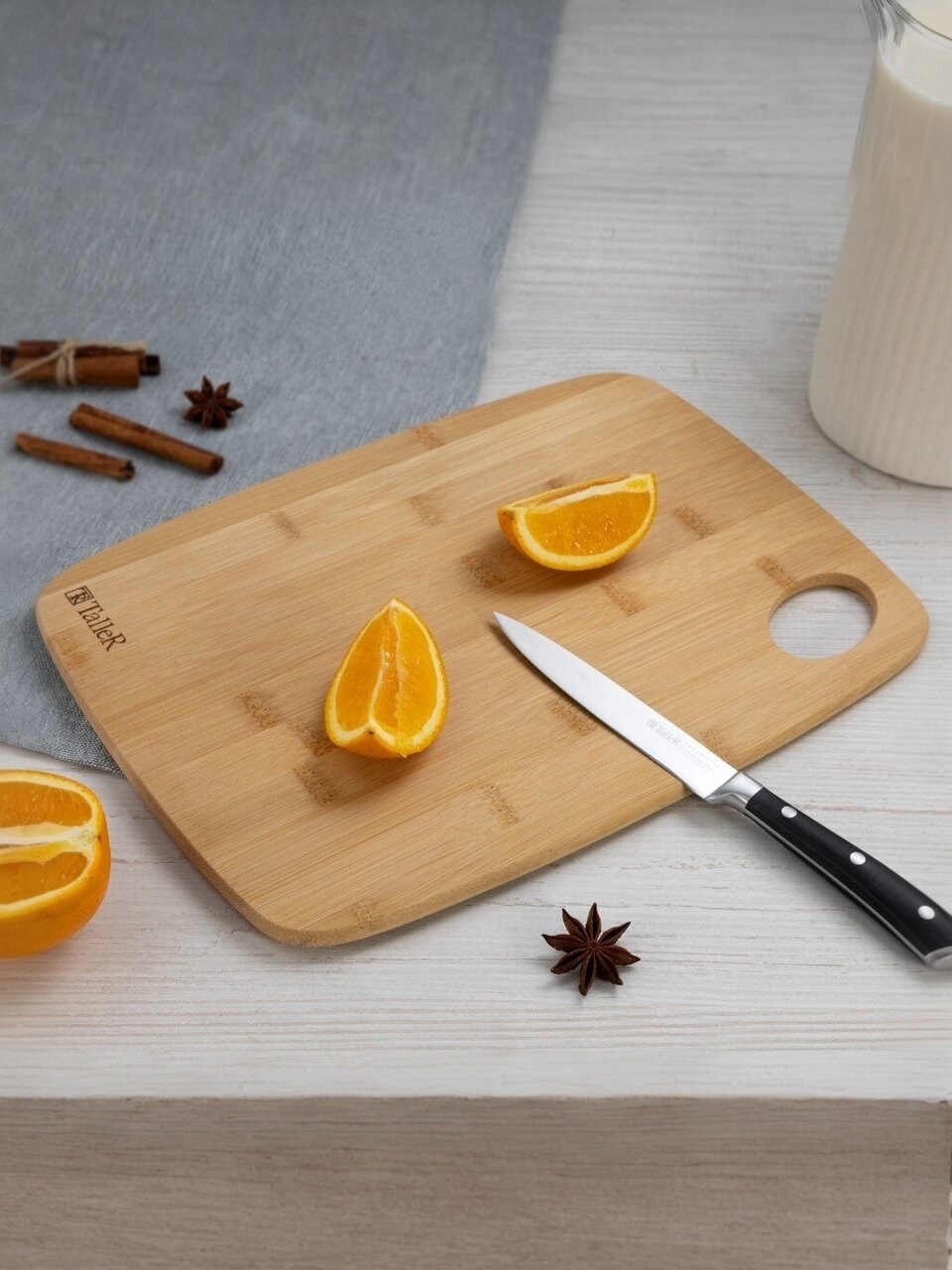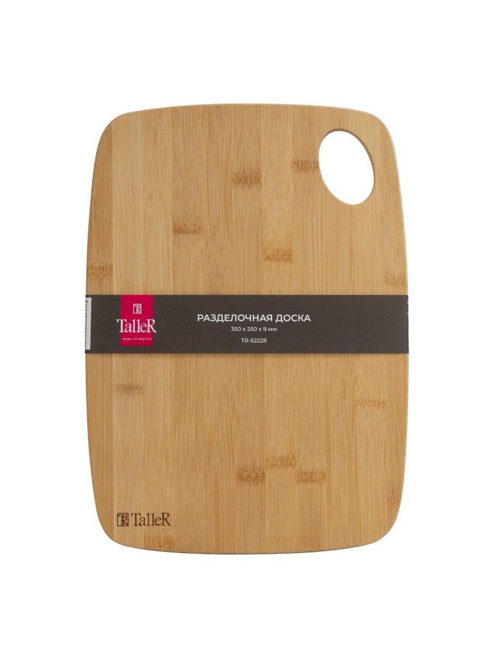 Ищете идеальную разделочную доску, которая станет надежным помощником на кухне? Разделочная доска бамбук, 35х25х0.9 см, с ручкой от Taller, модель TR-52228, создана для того, чтобы удовлетворить все ваши кулинарные потребности. Изготовленная из прочного бамбука, она не только долговечна, но и экологична. Прямоугольная форма и удобная ручка делают ее незаменимой для ежедневного использования.