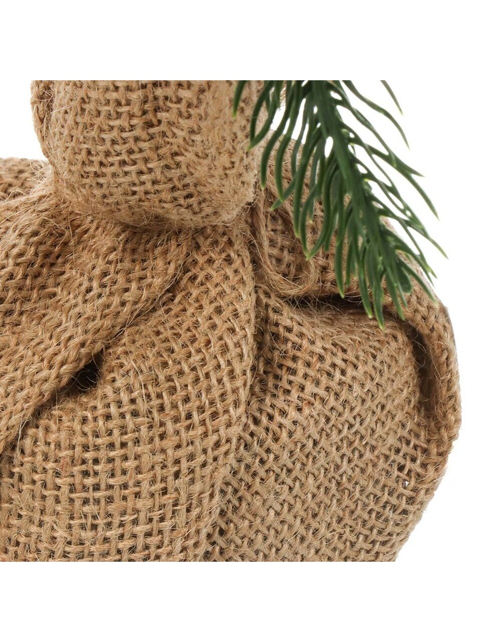 Елка выполнена из прочного полимера, хвоя имитирует натуральную зелень, подставка обтянута мешковиной для устойчивости и эко-стиля.