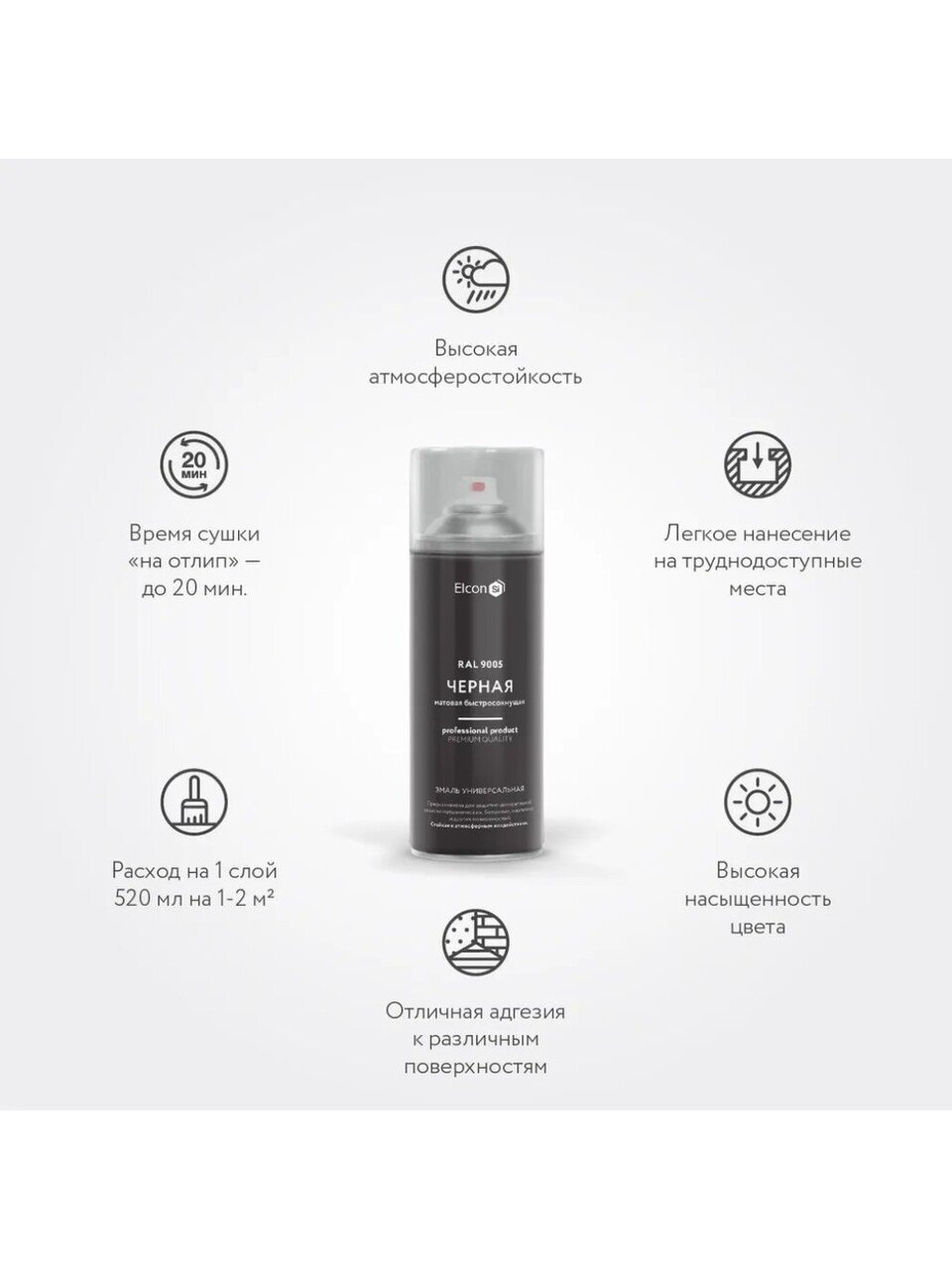 Вы можете приобрести «Эмаль аэрозольная, Elcon, универсальная, быстросохнущая, акриловая, матовая, черная, RAL 9005, 520 мл» и другие товары в нашем интернет-магазине в Астрахани по низким ценам и с бесплатным самовывозом.