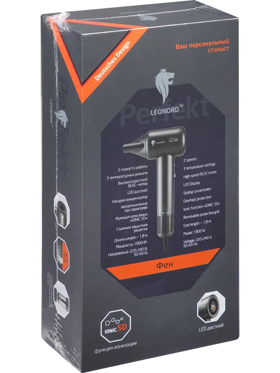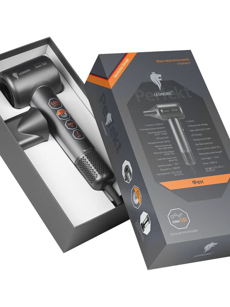 Фен Leonord LE-1214: мощность 1800 Вт, холодный обдув, ионизация, 3 режима, 2 скорости — быстрая укладка без перегрева и пересушивания волос.