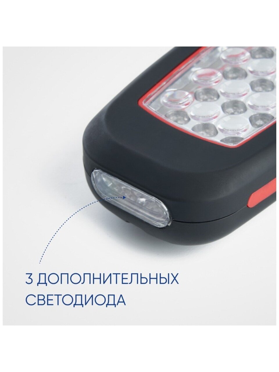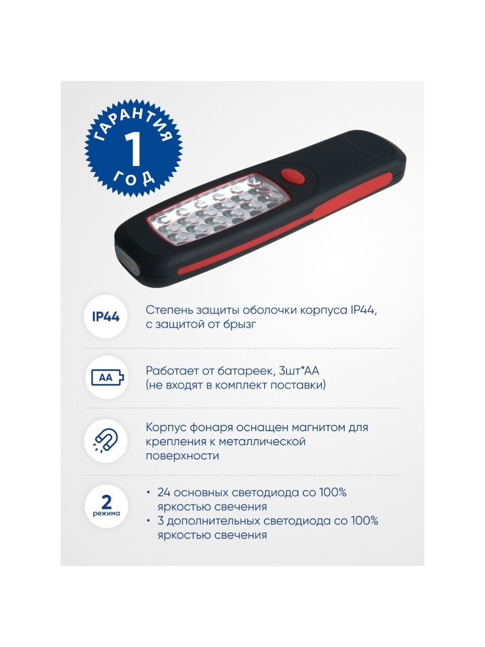 - Фонарь имеет два режима работы: 24 светодиода основного оптического блока со 100% яркостью свечения, 3 светодиода дополнительного оптического блока, расположенного сверху, со 100% яркостью свечения.