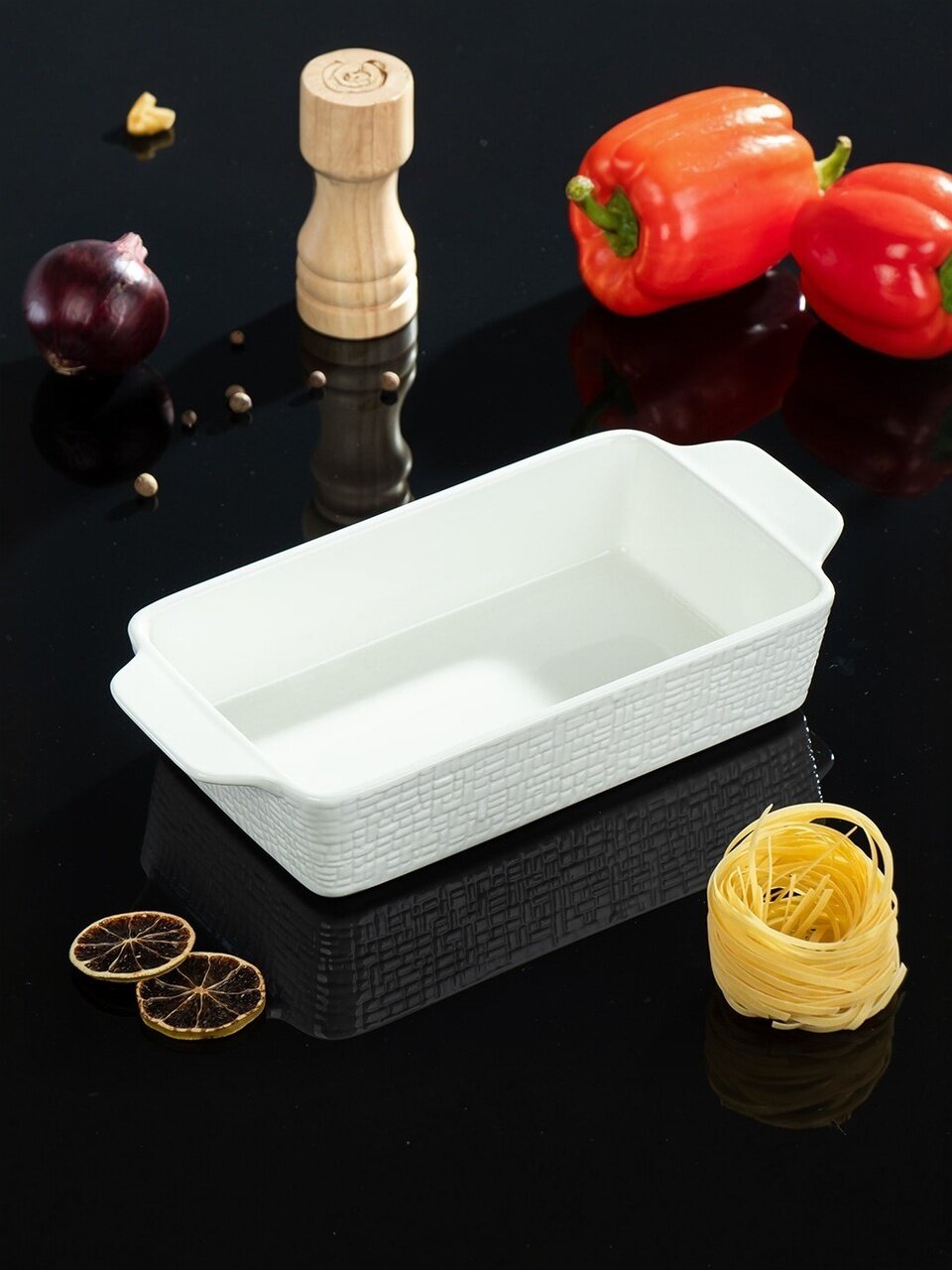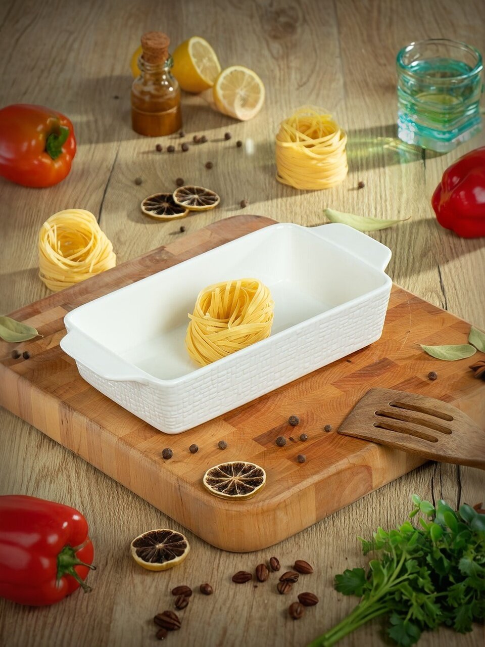 Чем отличается керамическая форма от стеклянной или металлической? Керамика лучше держит температуру, не выделяет вредных веществ при нагреве, подходит для запекания и подачи на стол. Прямоугольная форма удобна для курицы, рыбы, лазаньи или пирогов. Объем 1,21 л — это идеальный вариант для семьи или небольшого застолья. Как использовать форму: просто уложите ингредиенты, поставьте в духовку или микроволновку, а после — отправьте в посудомойку.