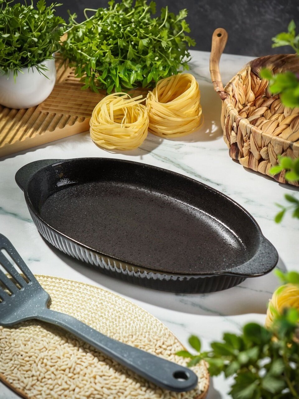 - Практичные размеры: вместимость 0.7 л, оптимальная глубина 2.5 см и овальная форма позволяют готовить порционные блюда или небольшие запеканки для семьи.