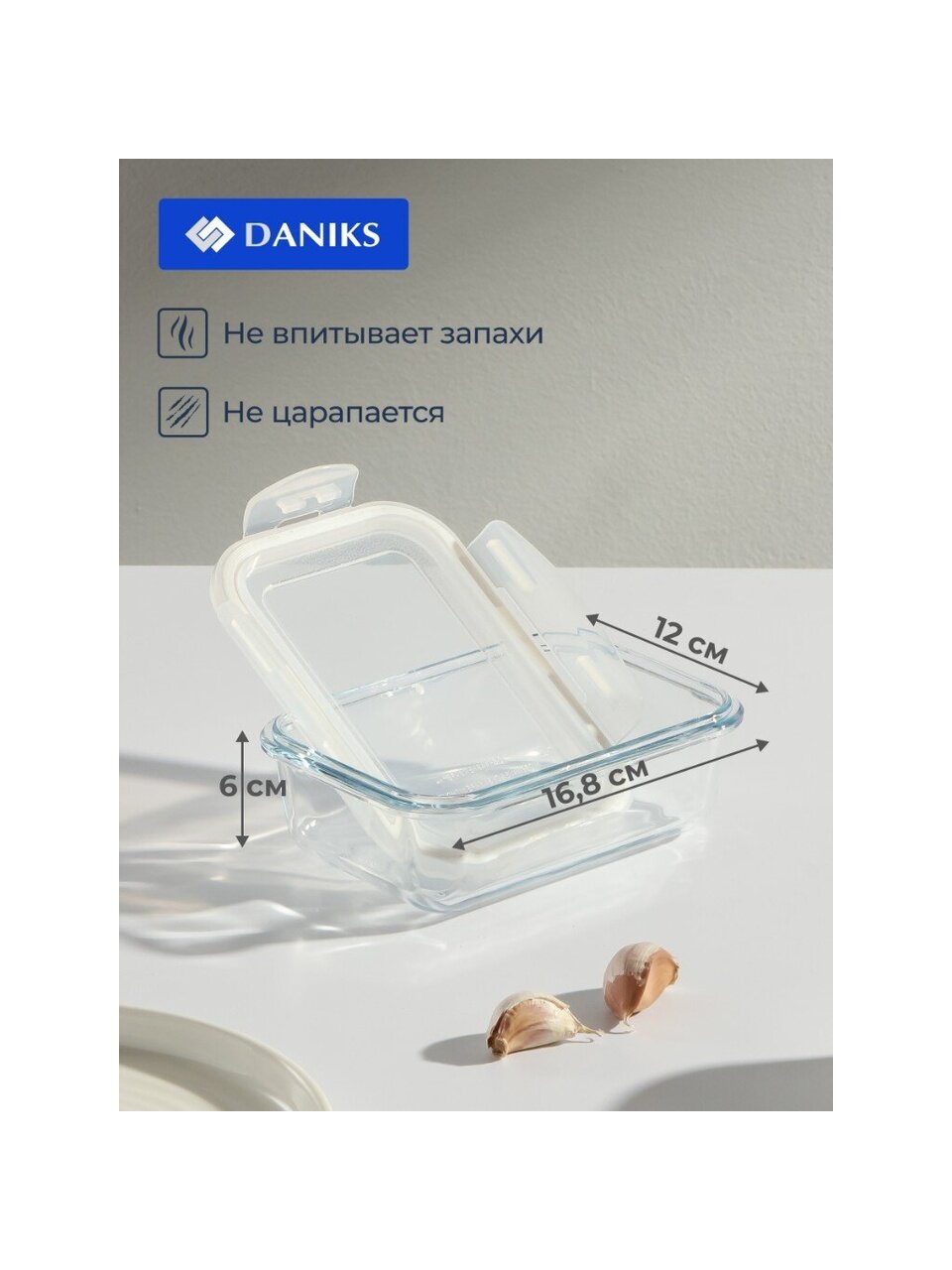 - Компактная прямоугольная форма (12×16,8×6 см), объём 0,57 л, идеально для порционных блюд и экономии места.