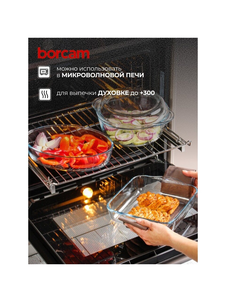 Набор жаропрочной посуды Borcam из 3 предметов — идеальное решение для тех, кто ищет, какую посуду выбрать для духовки и микроволновки. Овальные формы из прочного стекла (объём 2, 2 и 1,5 литра) подходят для запекания курицы, рыбы, куличей и других блюд. Крышка в комплекте помогает сохранять сочность и аромат, а прозрачный материал позволяет контролировать процесс готовки без открытия.