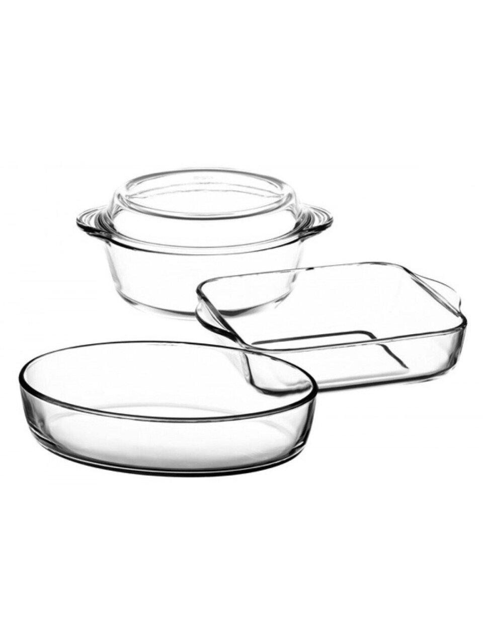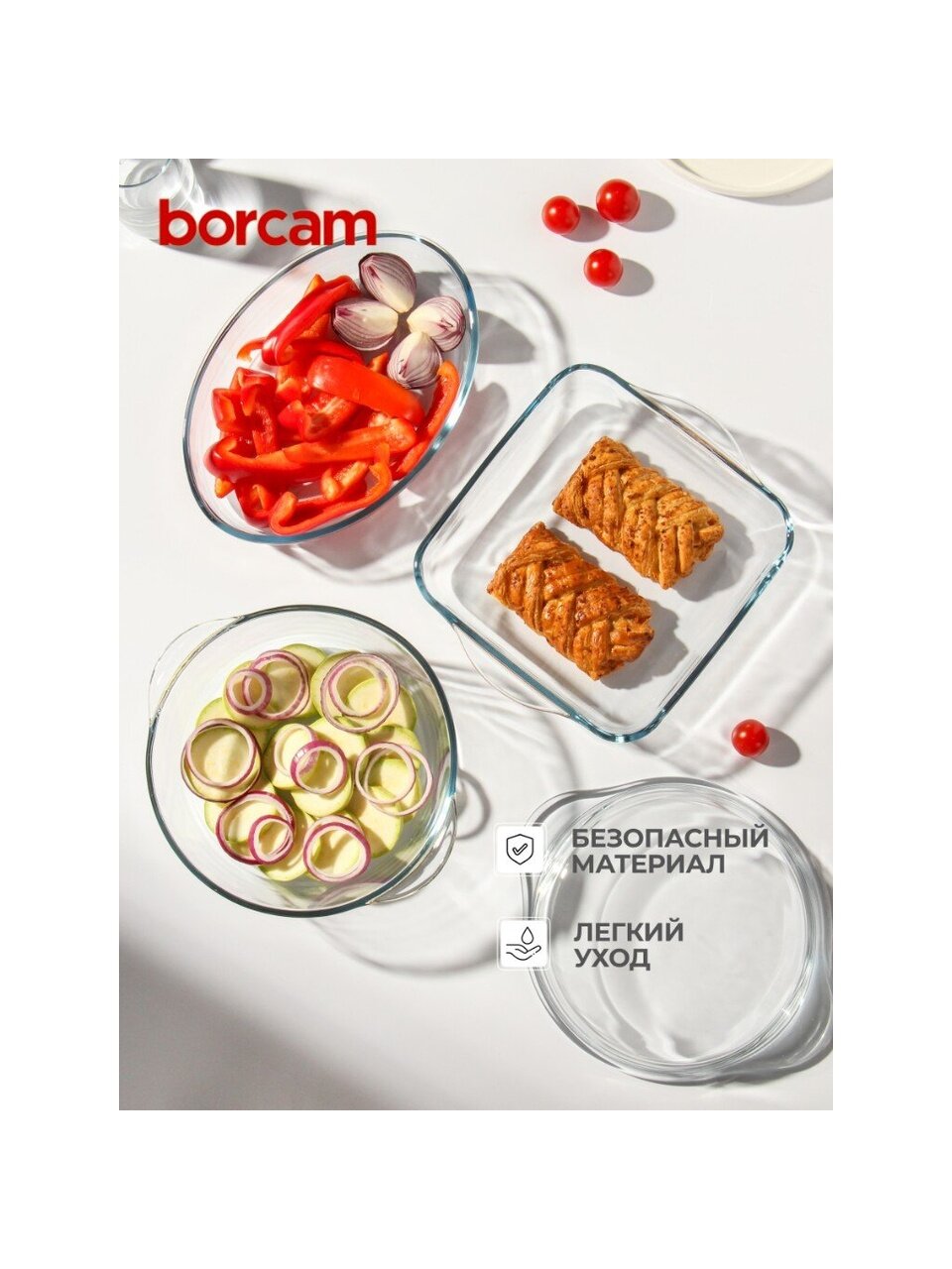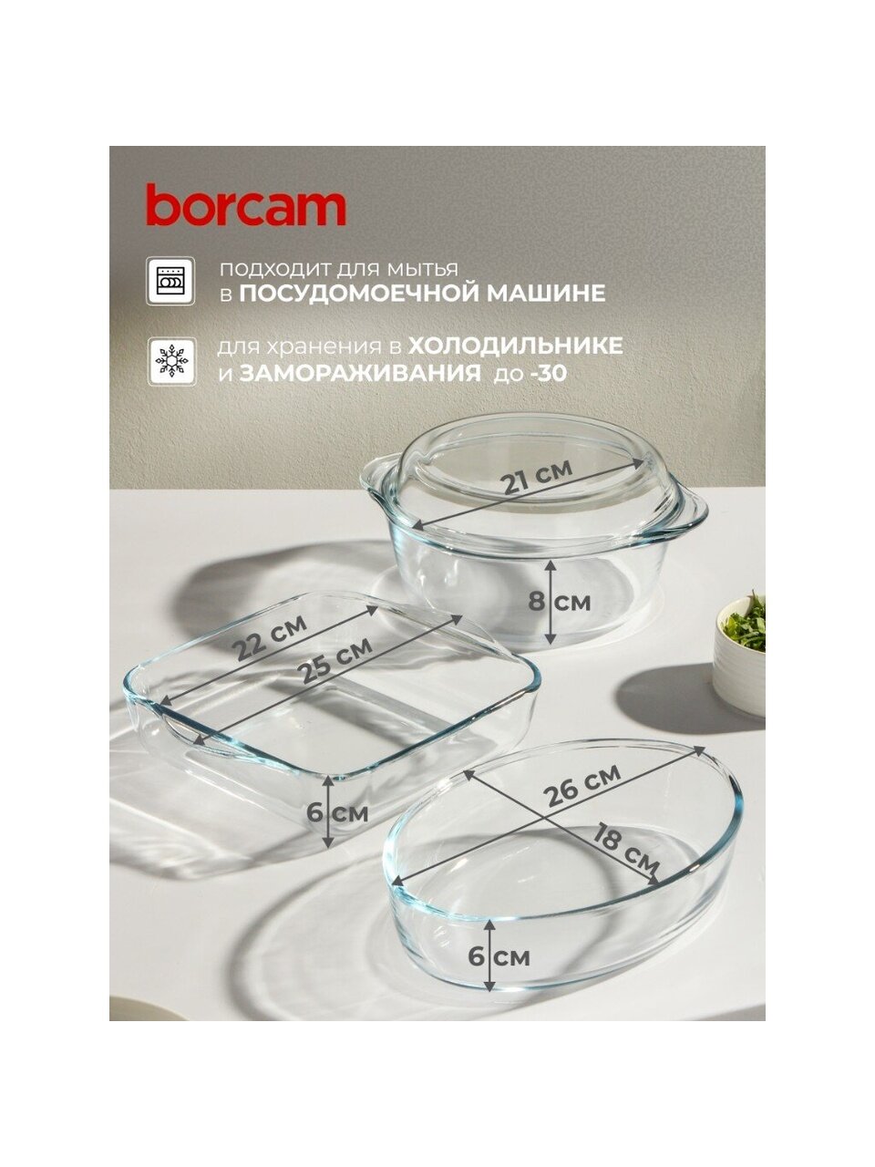 Набор жаропрочной посуды Borcam 3 шт: стекло, овальная форма, крышка — для духовки, СВЧ, посудомойки. Идеально для запекания и сервировки.