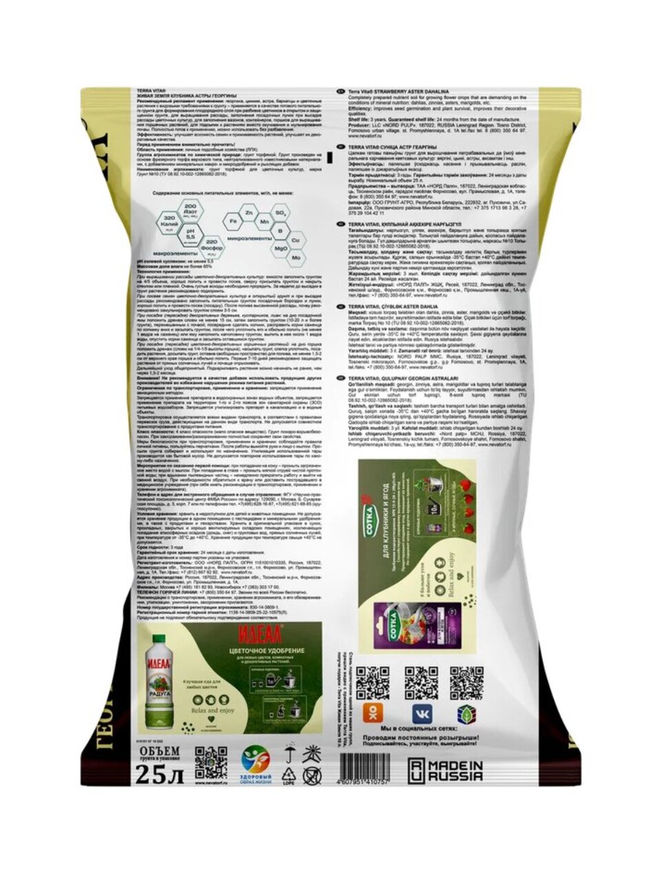 Объём — 25 литров. Грунт предназначен для клубники, георгин, астр, подходит для обогащения, посадки и повышения урожайности цветов и ягод.