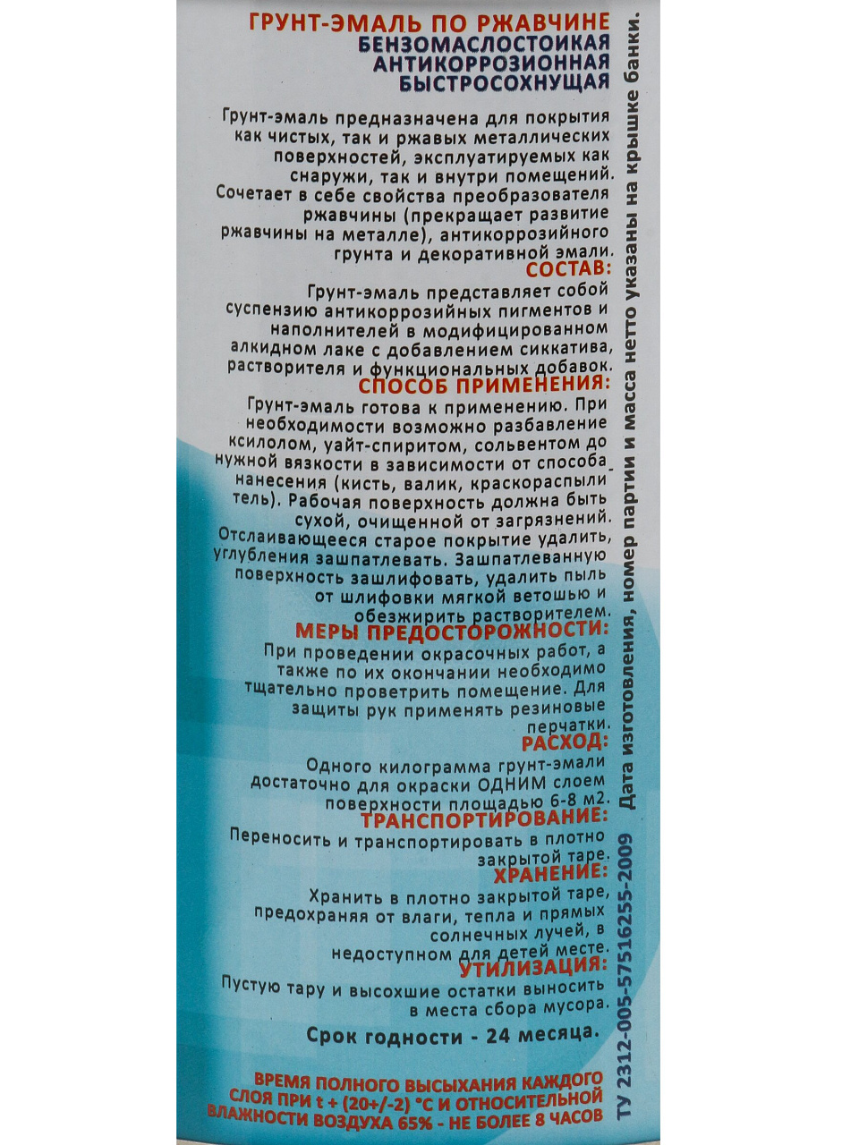 СОСТАВ: Грунт-эмаль представляет собой суспензию антикоррозийных пигментов и наполнителей в модифицированном алкидном лаке с добавлением сиккатива, растворителя и функциональных добавок.