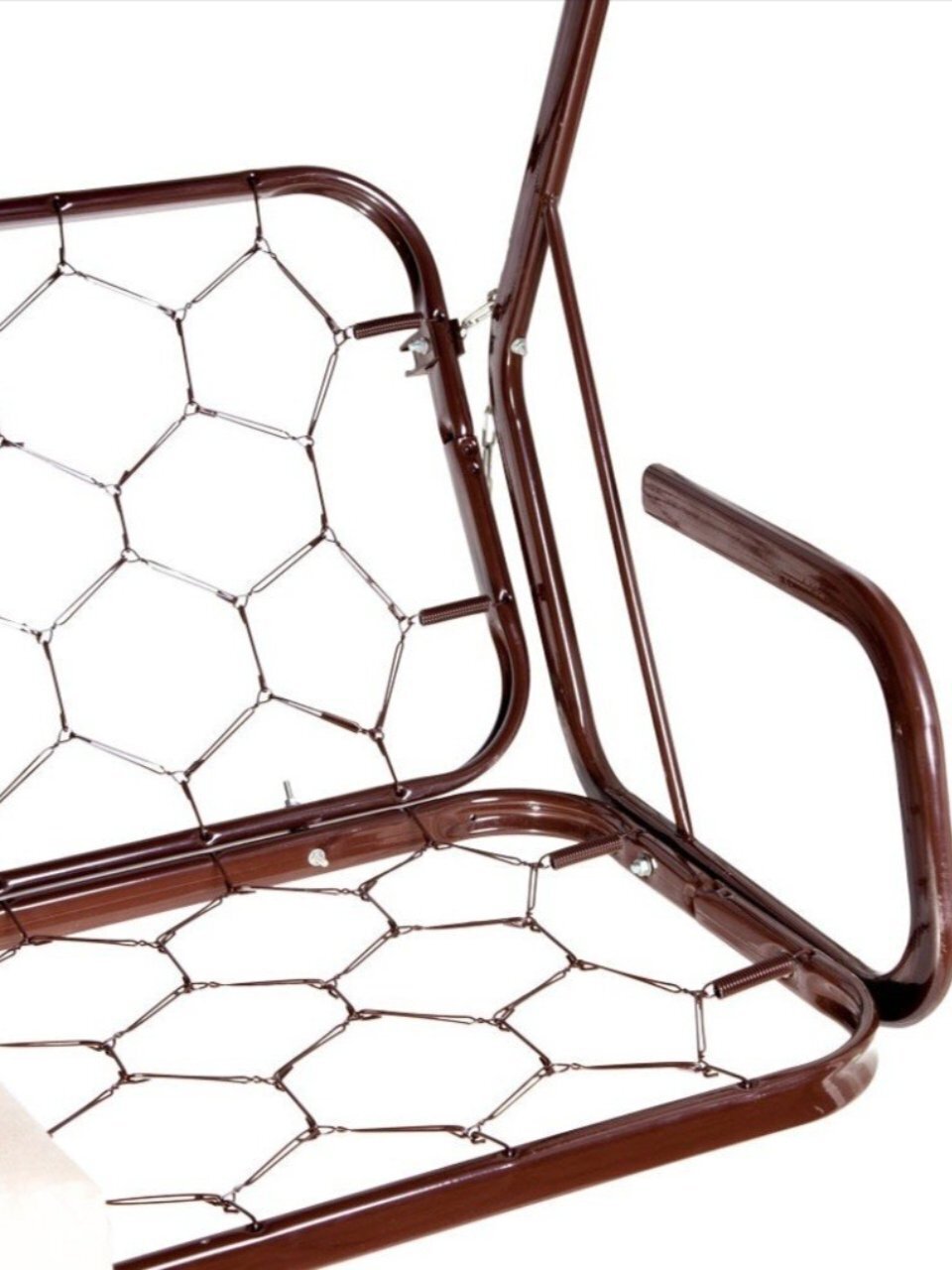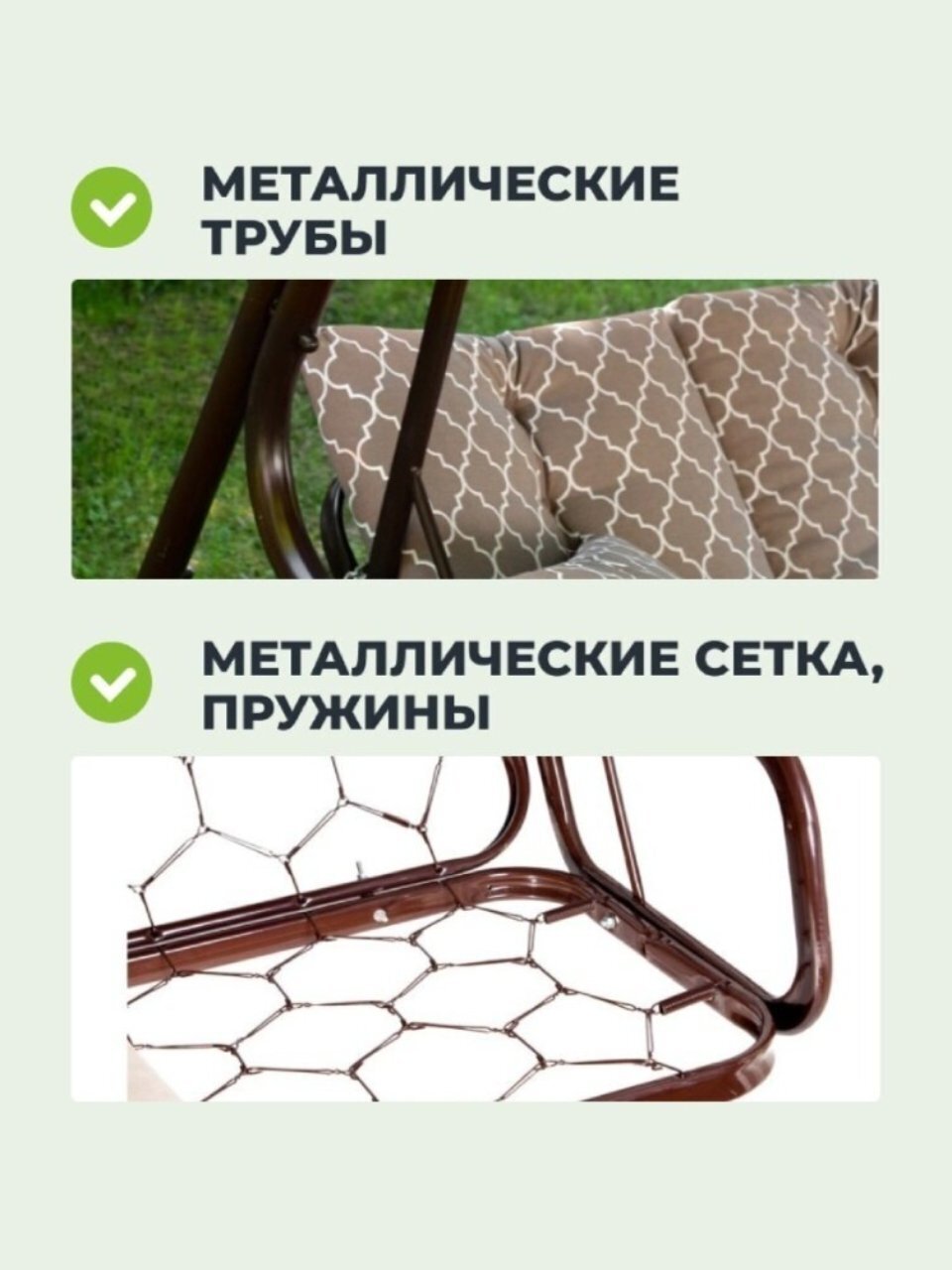 Каркас качелей выполнен из прочной стали, что обеспечивает долговечность и устойчивость конструкции. Оцинкованная сетка служит основой сиденья, а смесовая ткань создает приятные тактильные ощущения. Тент из полиэстера защищает от солнца, создавая тень и уютную атмосферу. Качели имеют дугообразные опоры, что придает им стильный вид и обеспечивает устойчивость.