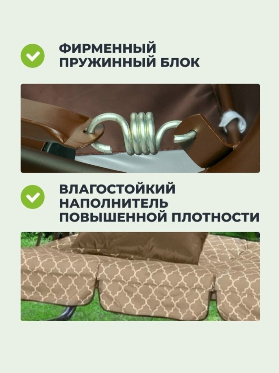 Качели Olsa Родео-2 рассчитаны на троих человек и способны выдержать нагрузку до 280 кг, что делает их идеальным выбором для семейного отдыха. Они легко трансформируются в удобную кровать, позволяя наслаждаться отдыхом на свежем воздухе в любое время дня. Подушки в комплекте обеспечивают дополнительный комфорт, а мягкий наполнитель из поролона толщиной 80 мм гарантирует приятные ощущения при использовании.