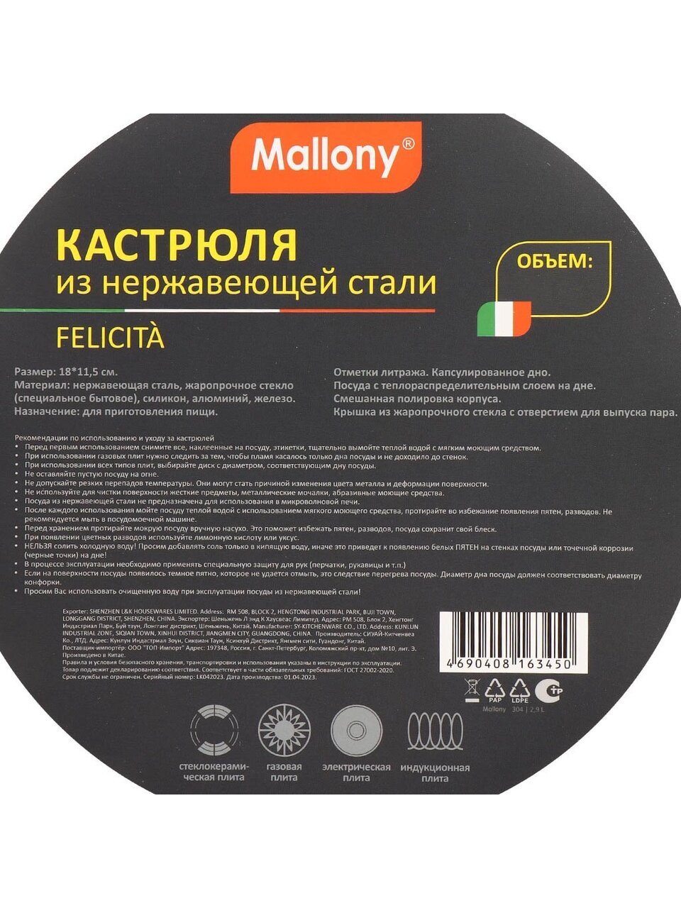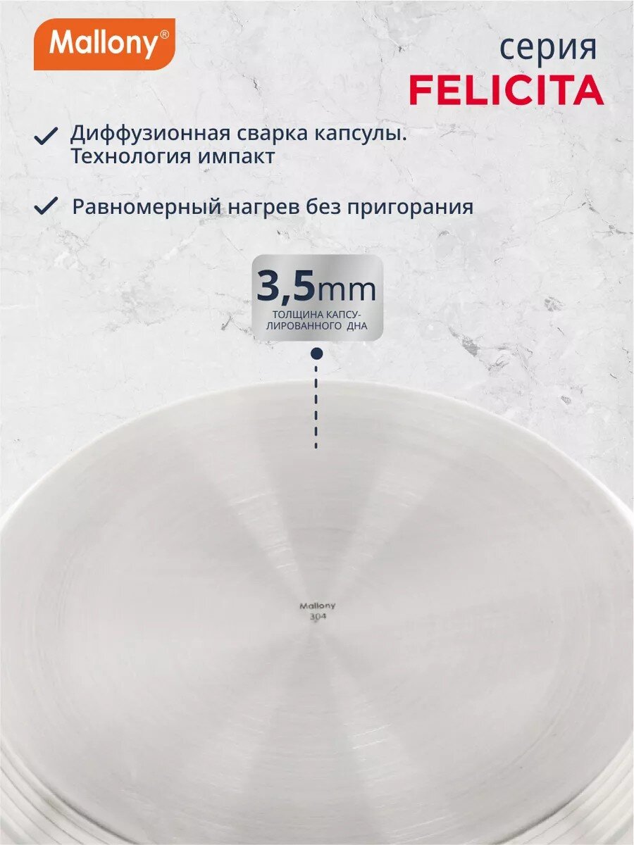 Кастрюля Mallony Felicità 3,9 л: идеальное решение для кухни — нержавеющая сталь, стеклянная крышка, силиконовые ручки, подходит для всех плит.