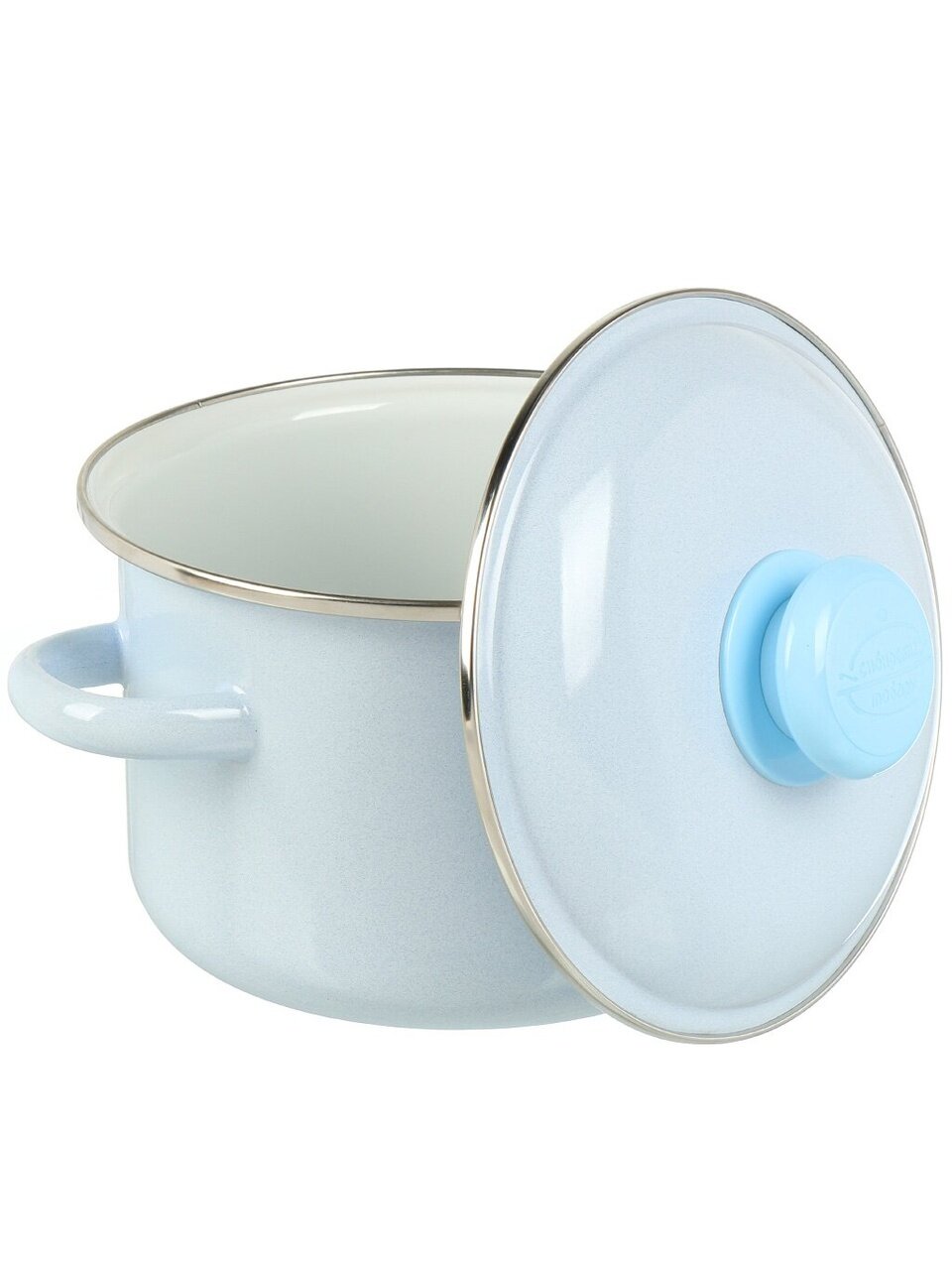 Эмалированная сталь корпуса не только придает изделию элегантный серо-голубой оттенок, но и обеспечивает надежную защиту от коррозии и механических повреждений. Толстое дно кастрюли гарантирует равномерное распределение тепла, что способствует более быстрому и качественному приготовлению пищи. Стальная крышка, входящая в комплект, плотно прилегает к кастрюле, сохраняя тепло и аромат блюд.