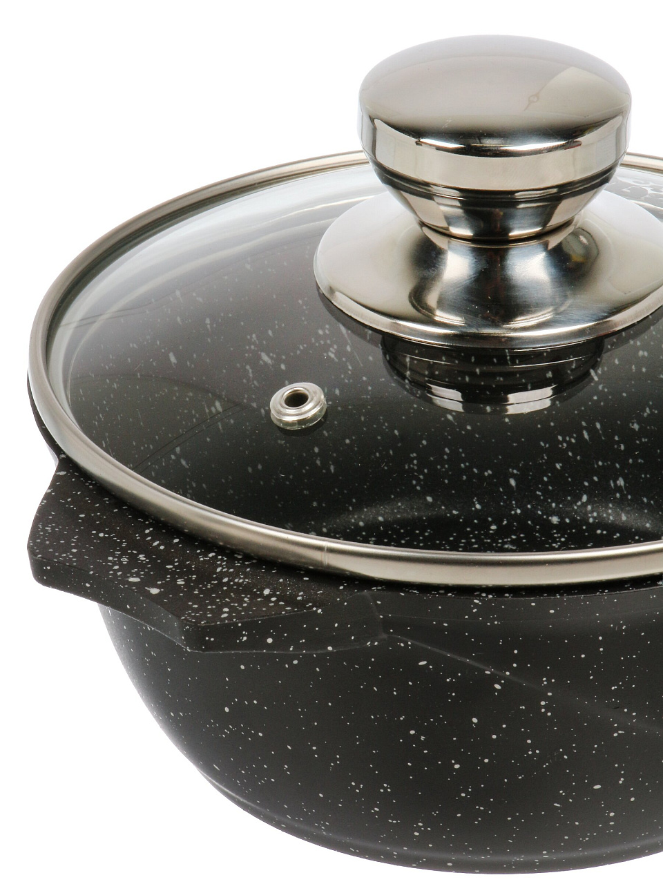 Объем — 1 литр, корпус — алюминий с гранитным антипригарным покрытием, крышка — жаропрочное стекло с выпускным клапаном.