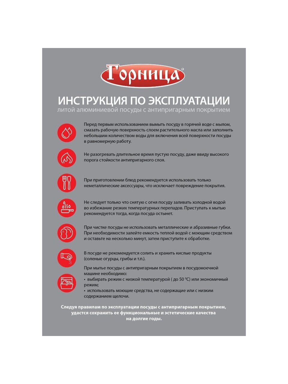 В производстве литой антипригарной посуды используется высококачественное сверхпрочное антипригарное покрытие, которое наносится методом напыления, что обеспечивает долговечность покрытия и высокую надежность нашей посуды. Применяемое покрытие не содержит в своем составе опасных для здоровья человека веществ PFOA и устойчиво к агрессивным средам и воздействиям температуры. При нагревании посуды также не выделяются вредные токсичные и канцерогенные вещества, использование такой посуды абсолютно безопасно.