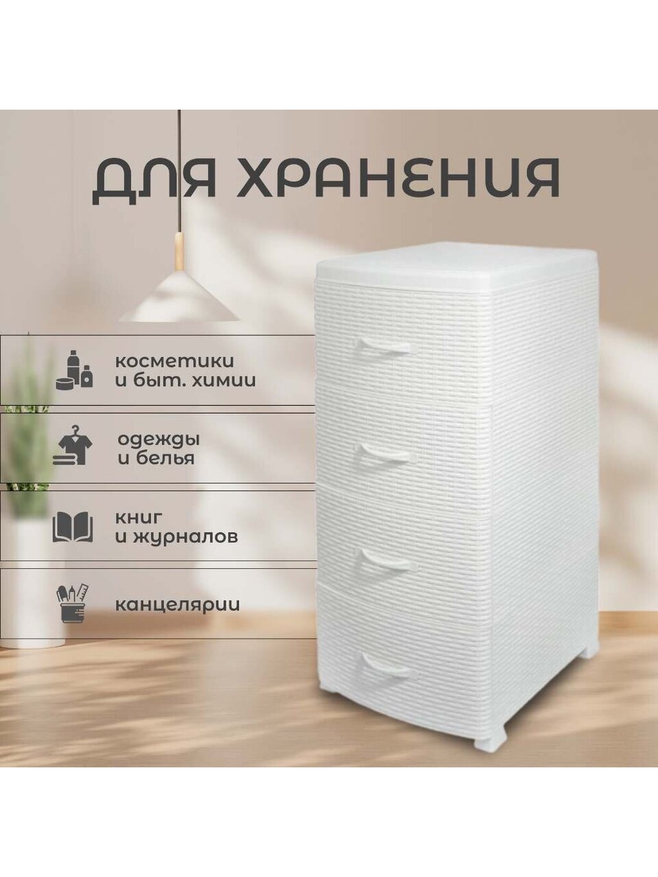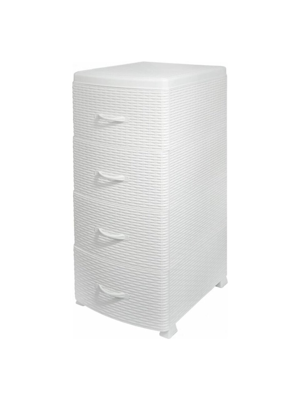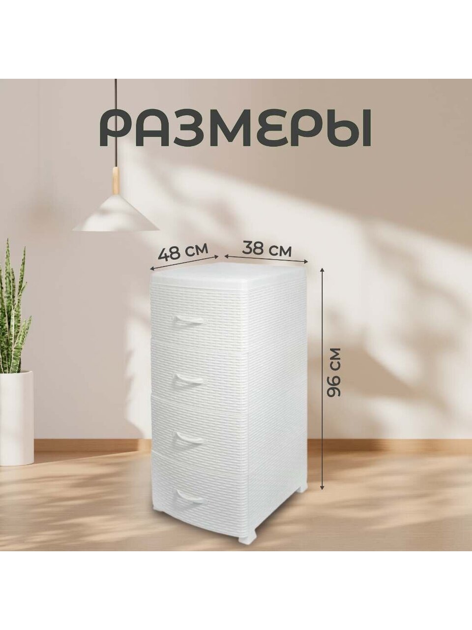 Комод из пищевого пластика с четырьмя выдвижными ящиками предназначен для хранения вещей и продуктов питания и гармонично впишется в интерьер любой комнаты. Легкий и вместительный комод поможет обеспечить порядок, избавит от разбросанных игрушек и одежды, убережет продукты от пыли и заветривания. Текстура с имитацией натурального плетения «Ротанг» привнесет уют в ваш интерьер и придаст индивидуальность. Не рекомендуется размещение пластикового комода вблизи батарей центрального отопления и электрических обогревателей.