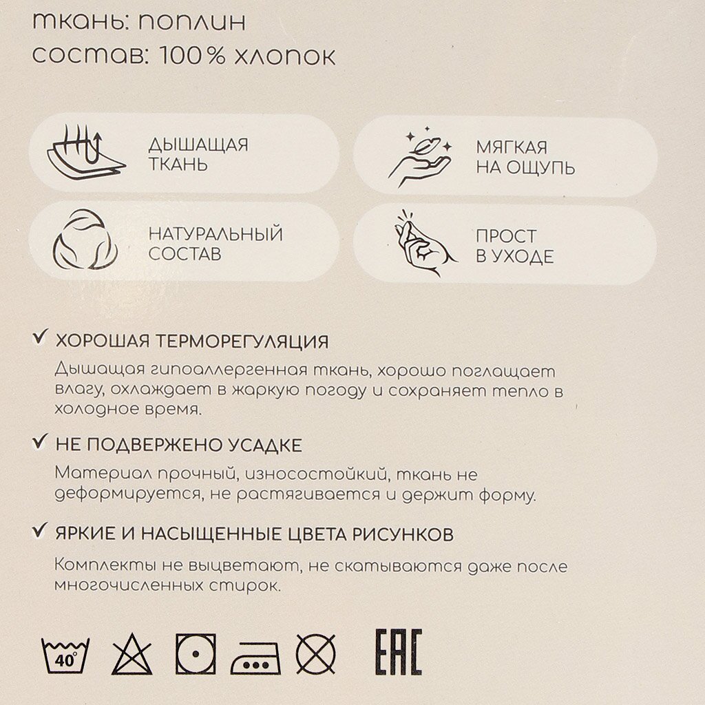 Комплект выполнен из 100% хлопкового поплина, что обеспечивает мягкость, гипоаллергенность и долгий срок службы. Размер пододеяльника — 175×215 см, наволочек — 50×70 см.