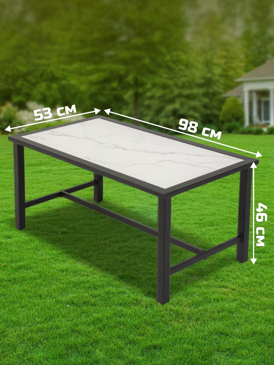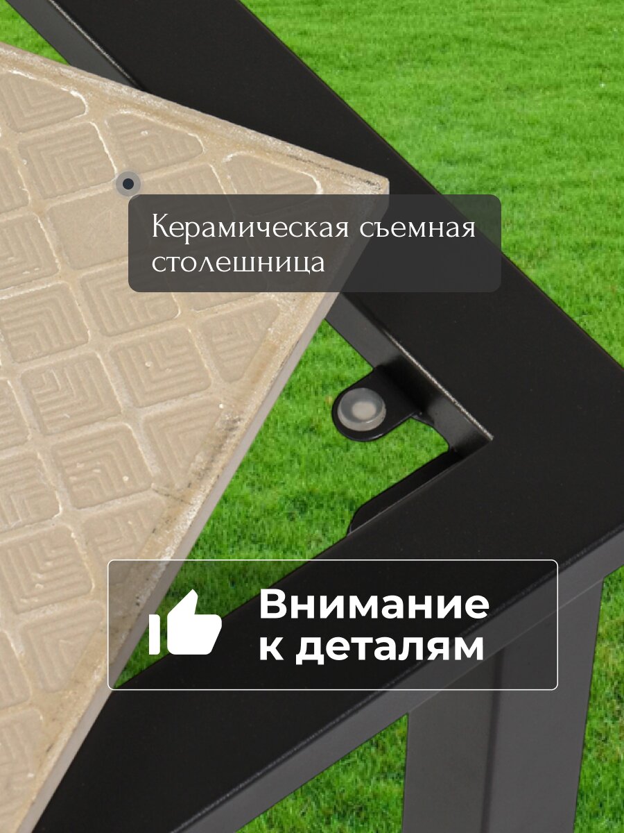 Габариты мебели продуманы для удобного размещения четырех персон, что делает комплект отличным выбором для семейных ужинов, чаепитий или посиделок с друзьями. Столешница прямоугольной формы практична и удобна для сервировки. Каркас мебели обеспечивает надежность и долговечность конструкции. Благодаря универсальному дизайну, комплект подходит как для использования на открытом воздухе, так и в помещении.