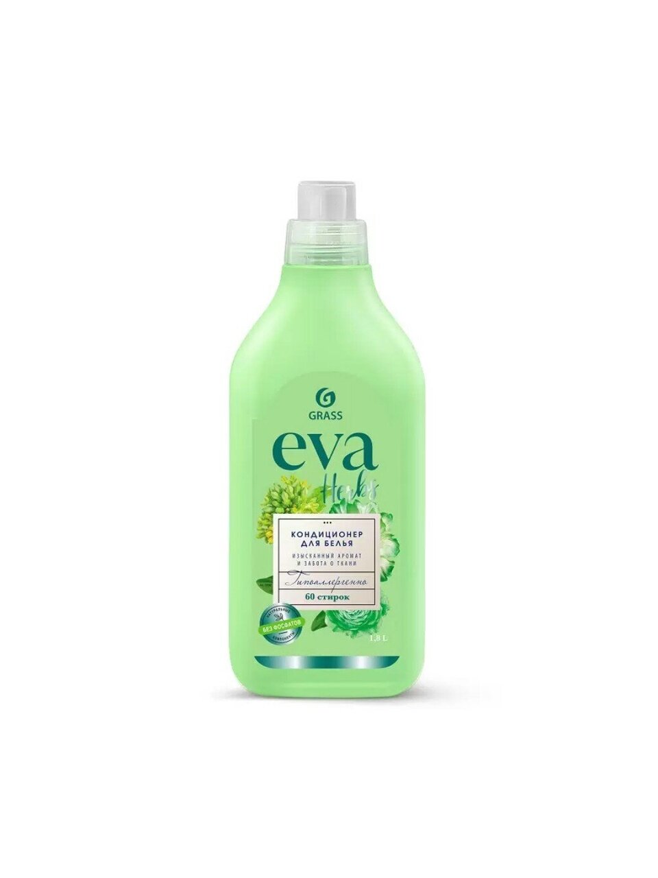 Концентрированный кондиционер для белья Grass Eva Herbs 1.8 л: свежесть, мягкость и экономия до 60% на каждой стирке — для заботы о вашей семье и бюджете.