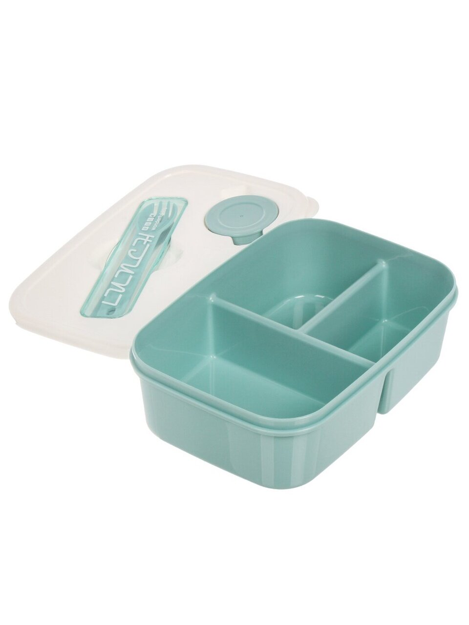 Ланч-бокс пластиковый 20.3х13х7 см с бирюзовой крышкой — современное решение для хранения и транспортировки еды. Благодаря продуманной конструкции с несколькими отделениями и наличию ложки, этот контейнер-органайзер позволяет удобно брать с собой разнообразные блюда: салаты, гарниры, закуски. Уплотнённая крышка на защёлке надёжно предотвращает протекание, а пластик не впитывает запахи, легко моется и подходит для использования в микроволновке.