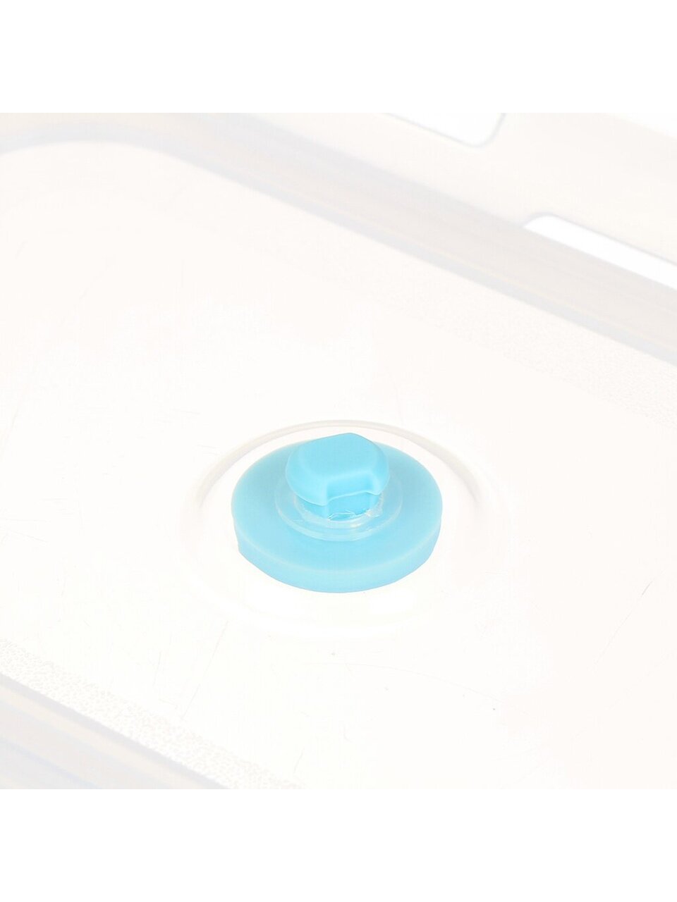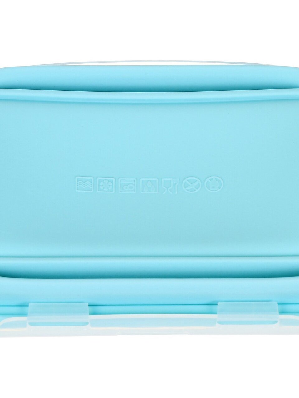 Контейнер прямоугольный, длина 18 см, ширина 12 см, объём 0.8 литра. Цвет — голубой, материал — силикон и пластик.