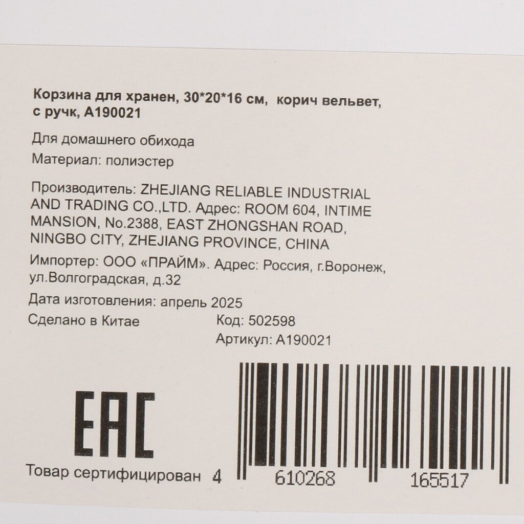 Вы можете приобрести «Корзина для хранения, 30х20х16 см, прямоугольная, вельвет, коричневая, A190021» и другие товары в нашем интернет-магазине в Старом Осколе по низким ценам и с бесплатным самовывозом.