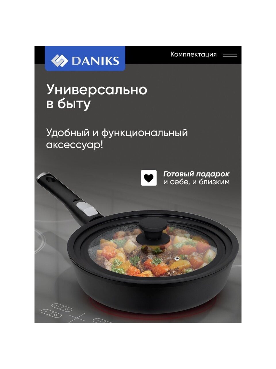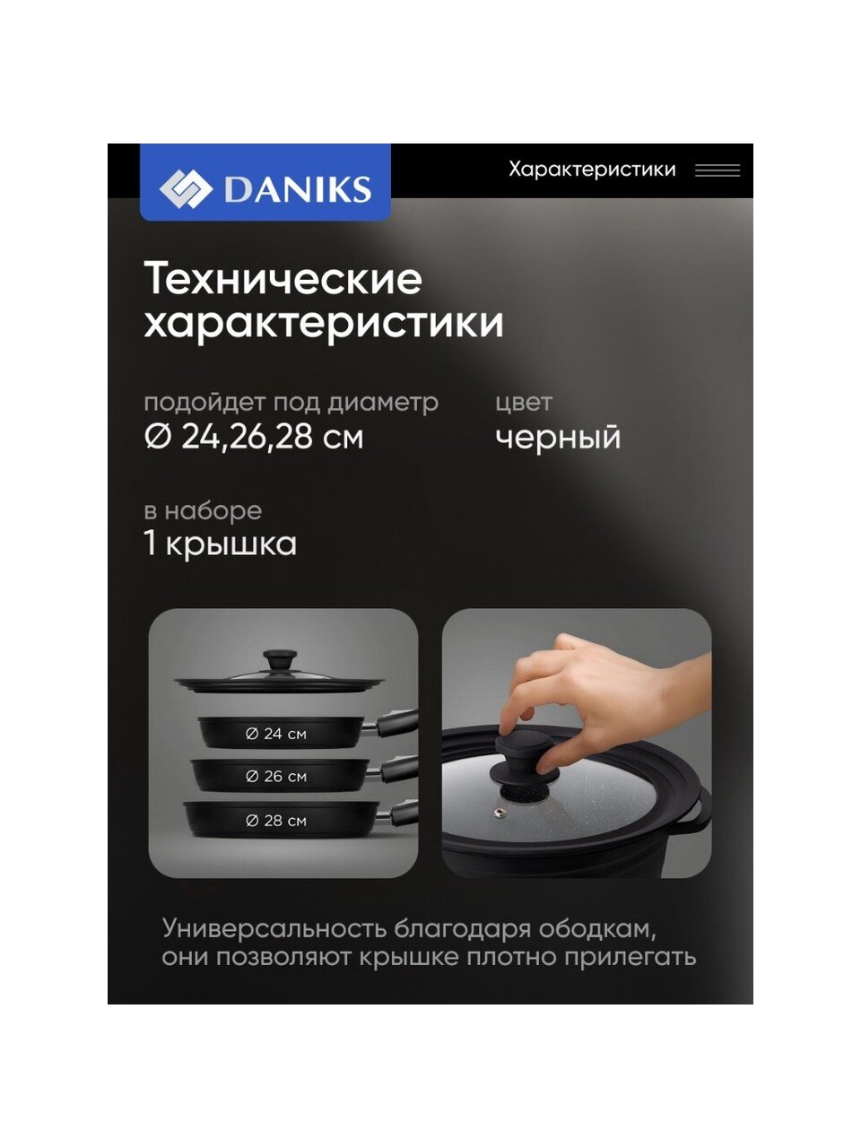 Вы можете приобрести «Крышка для посуды стекло, Daniks, кнопка силикон, черная, 24/26/28 см, GLM-242628» и другие товары в нашем интернет-магазине в Астрахани по низким ценам и с бесплатным самовывозом.
