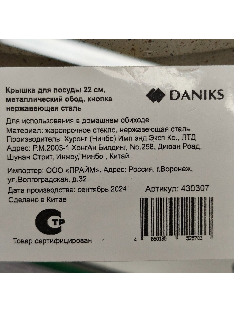 Вы можете приобрести «Крышка для посуды стекло, 22 см, Daniks, металлический обод, кнопка нержавеющая сталь, Д5722» и другие товары в нашем интернет-магазине в Нижнем Новгороде по низким ценам и с бесплатным самовывозом.