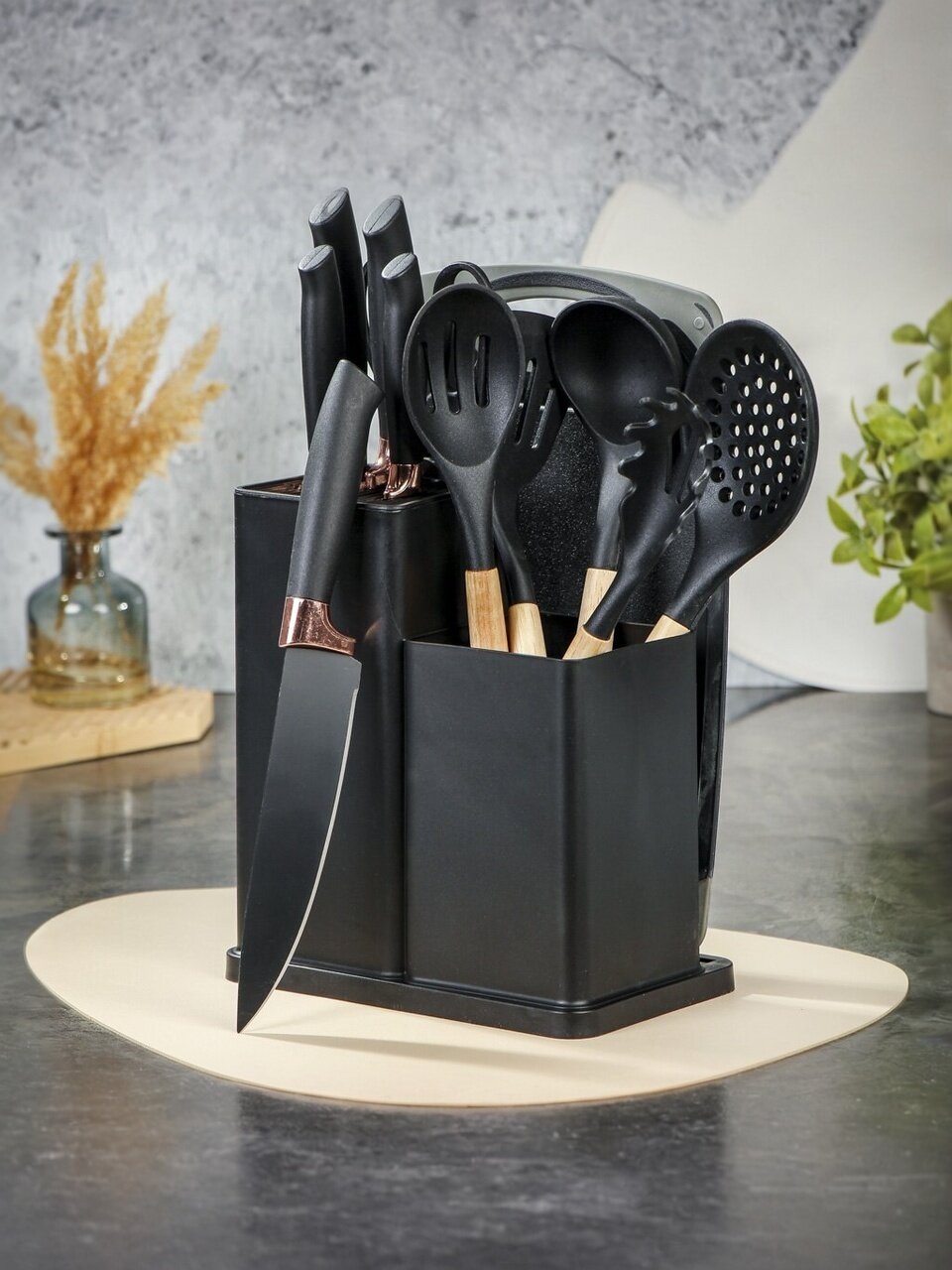 - удобство хранения: все предметы аккуратно размещены на стильной подставке, что экономит место на кухне;