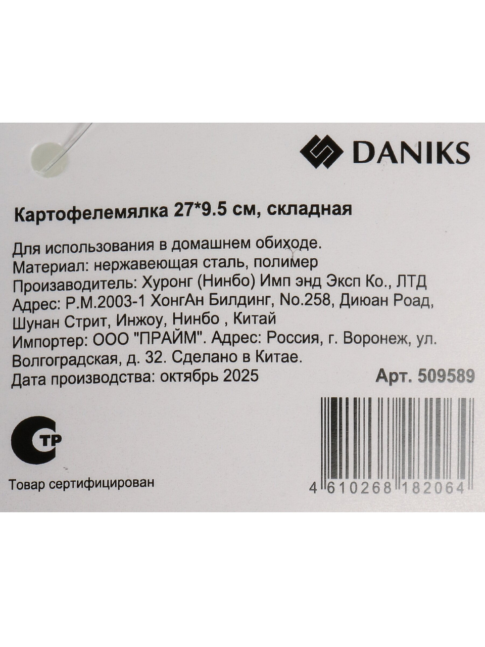 Закажите складную картофелемялку Daniks сейчас — получите быстрый доступ к свежему пюре, качественным материалам и выгодной цене. Гарантия надёжности и быстрая доставка по России.