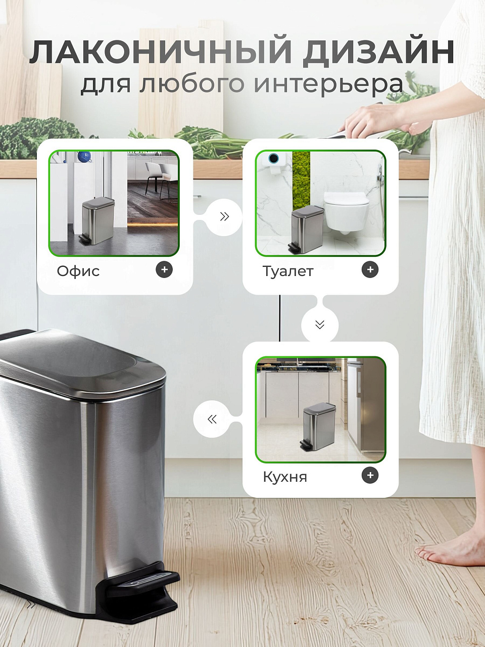 Педаль для открытия крышки позволяет открывать и закрывать контейнер без использования рук. Это особенно полезно при работе с пищевыми отходами, когда руки могут быть загрязнены. Благодаря этому пользователь может избежать контакта с мусором и сохранить чистоту рук. Кроме того, такой контейнер удобен для людей с ограниченными физическими возможностями, так как не требует усилий для открытия крышки.