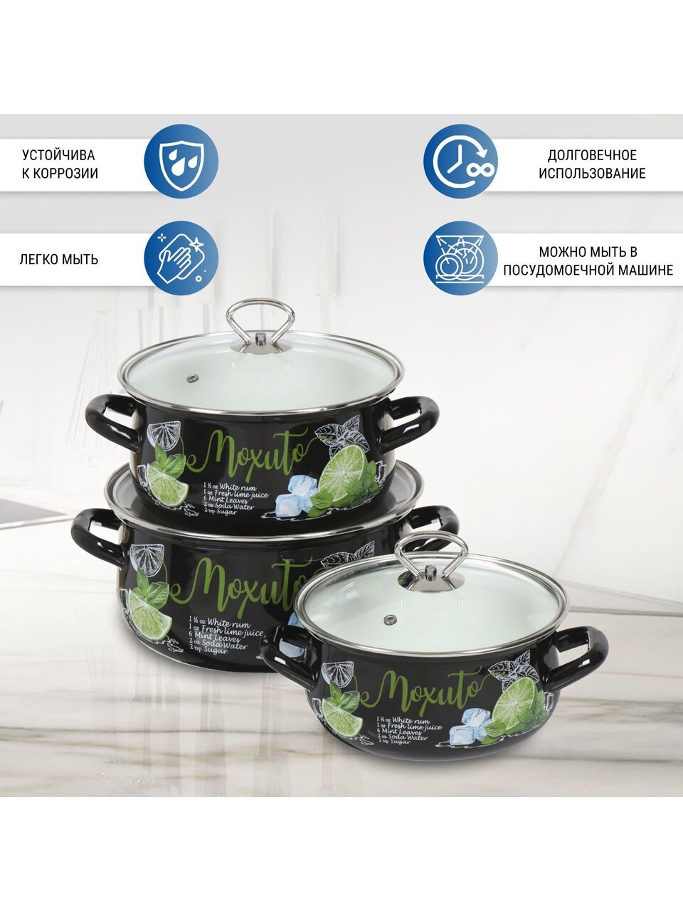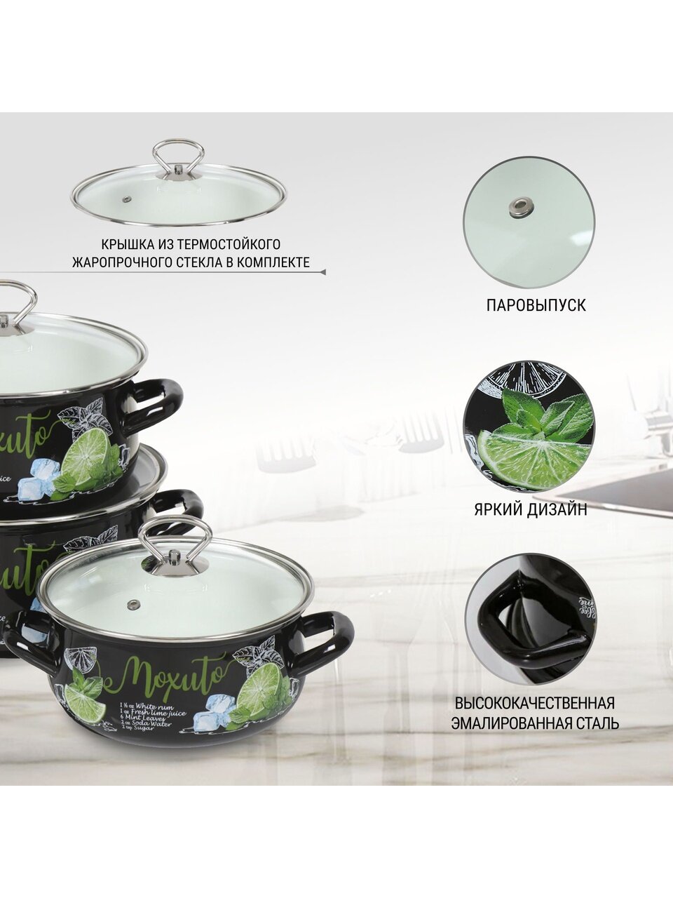 Выбирайте оригинальный набор кастрюль Мохито-1 Экстра Стиль — выгодное предложение для тех, кто ценит надёжность и современный стиль. Оформите заказ прямо сейчас и получите качественную посуду с доставкой по России.