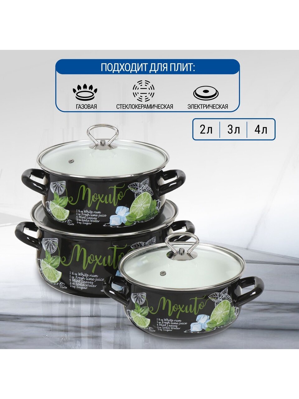 Вы можете приобрести «Набор посуды эмалированная сталь, 6 предметов, кастрюли 2,3,4 л, МП, Керченский металлургический завод, Мохито-1 Экстра Стиль, черный» и другие товары в нашем интернет-магазине в Обнинске по низким ценам и с бесплатным самовывозом.