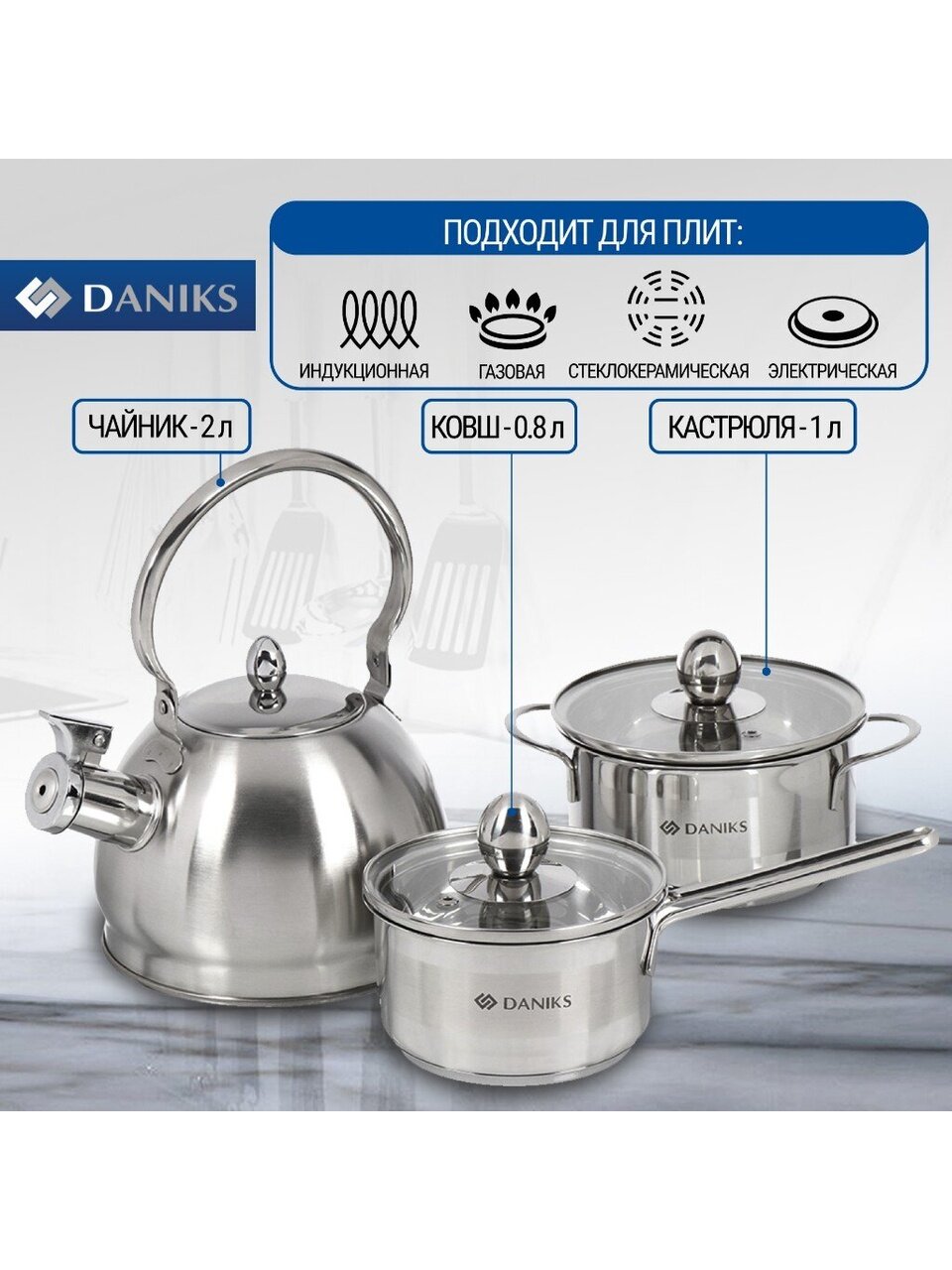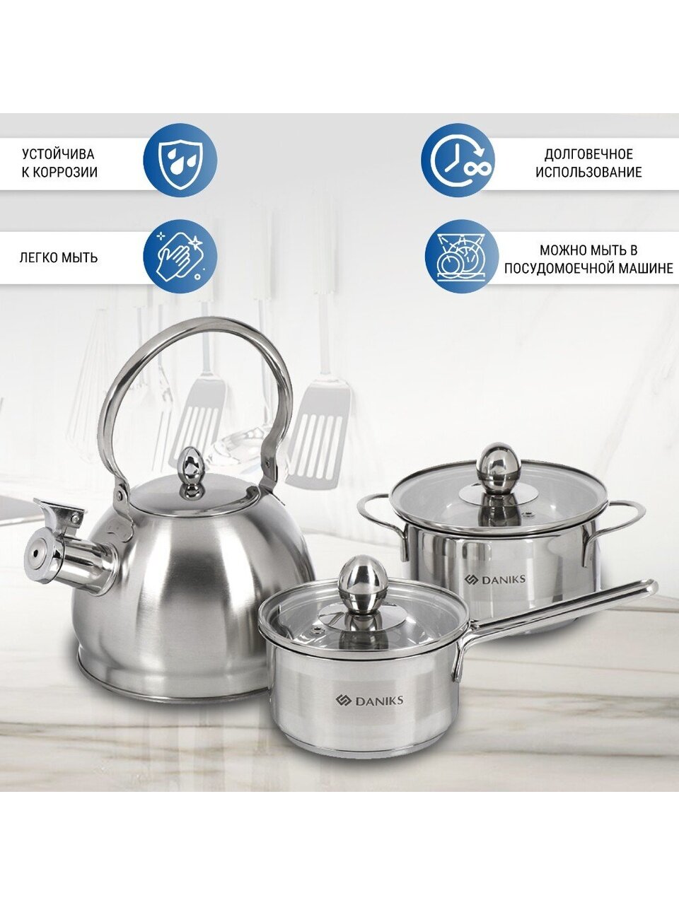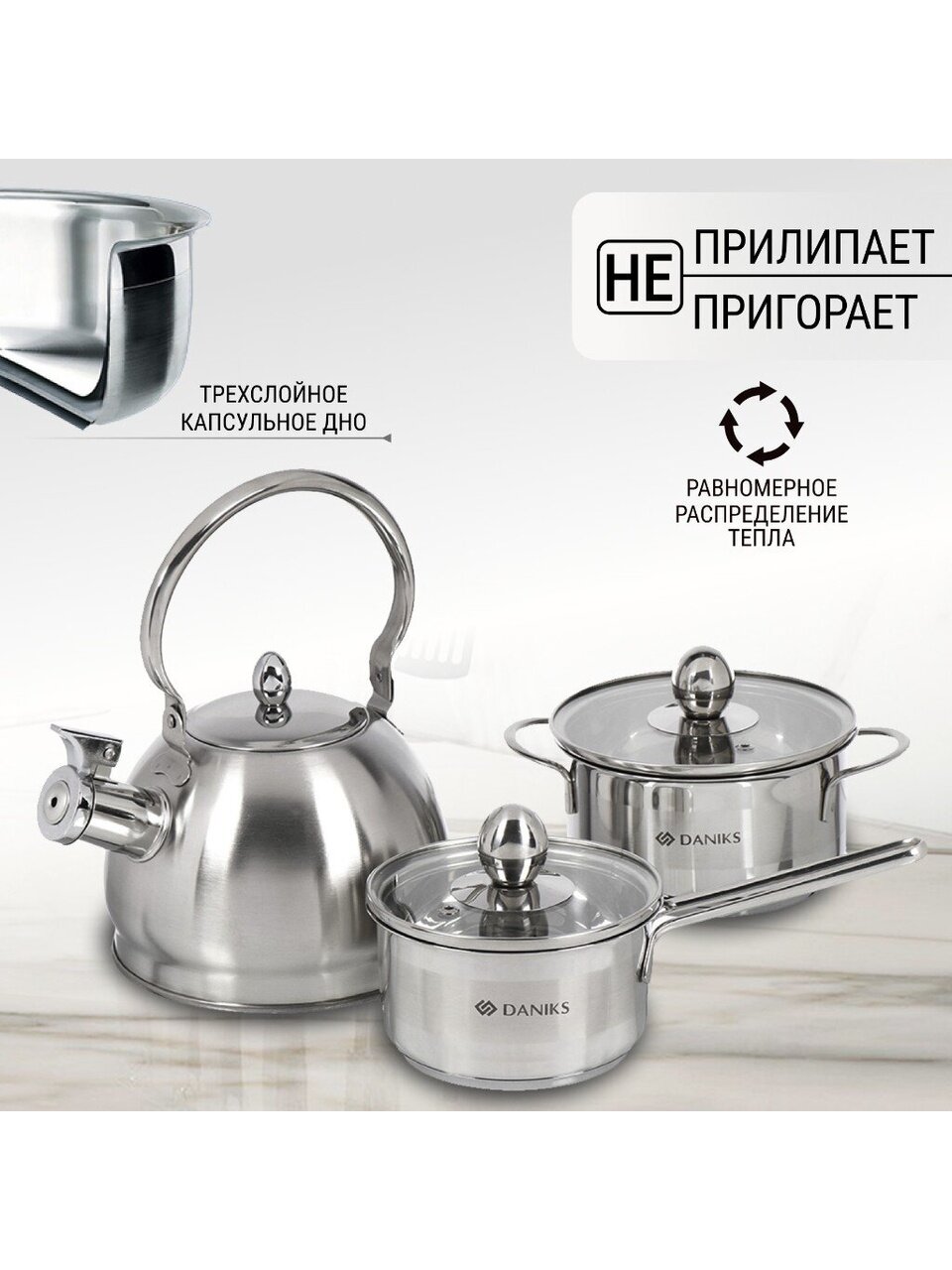 Для тех, кто ищет недорогой набор посуды для дачи или универсальный подарок, этот комплект — практичное решение. Гарантия 12 месяцев, проверенное качество Daniks, современный хромовый дизайн впишется в любую кухню.