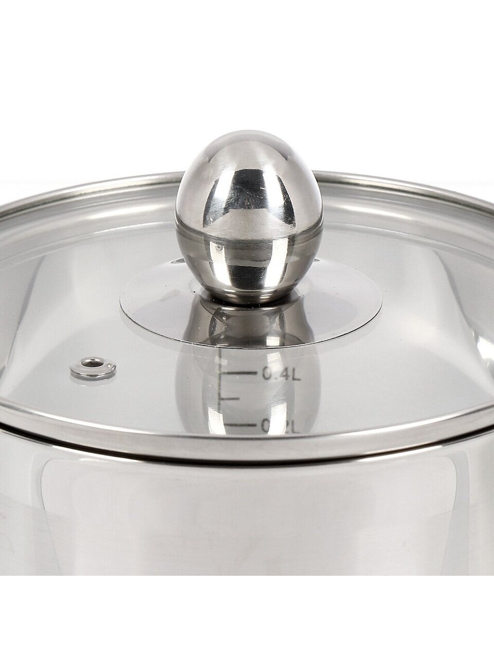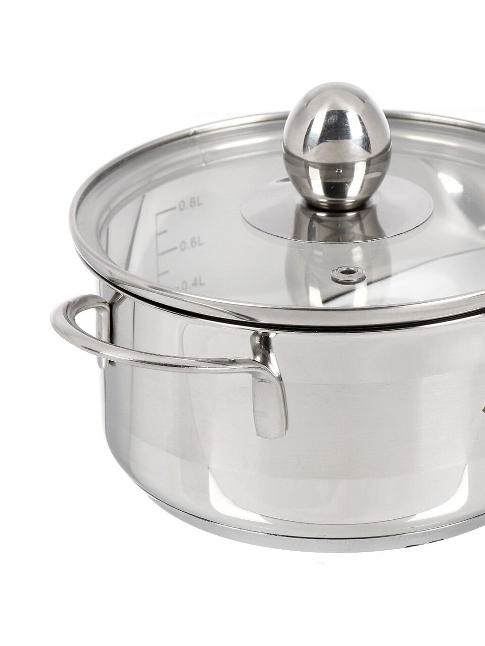 Кастрюля — 1 л, ковш — 0,8 л, чайник — 2 л. Крышка из стекла с клапаном в комплекте для удобства приготовления.