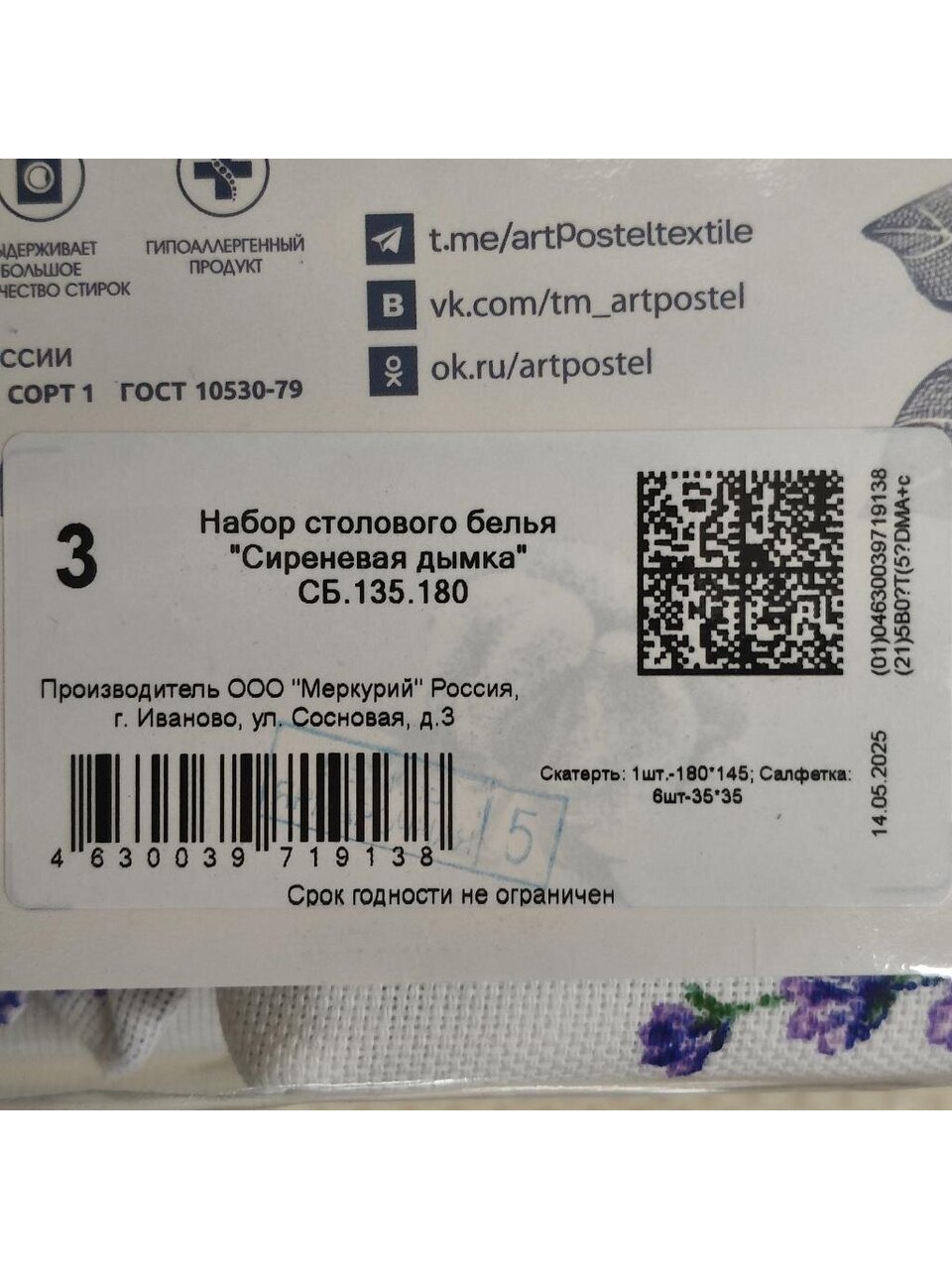 Вы можете приобрести «Набор столового текстиля скатерть 180х145 см + 6 салфеток 35х35 см, 100% хлопок, рогожка, АртДизайн, Сиреневая дымка, СБ.135.180» и другие товары в нашем интернет-магазине в Ельце по низким ценам и с бесплатным самовывозом.