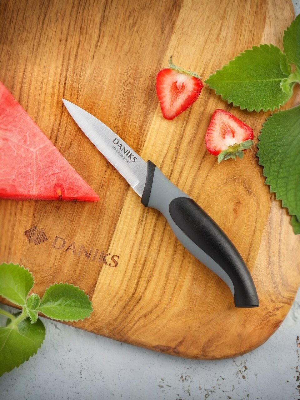 Вы можете приобрести «Нож кухонный Daniks, Модерн, для овощей, нержавеющая сталь, 9 см, рукоятка пластик, YW-A040-PA/YW-A040G-PA» и другие товары в нашем интернет-магазине в Серпухове по низким ценам и с бесплатным самовывозом.