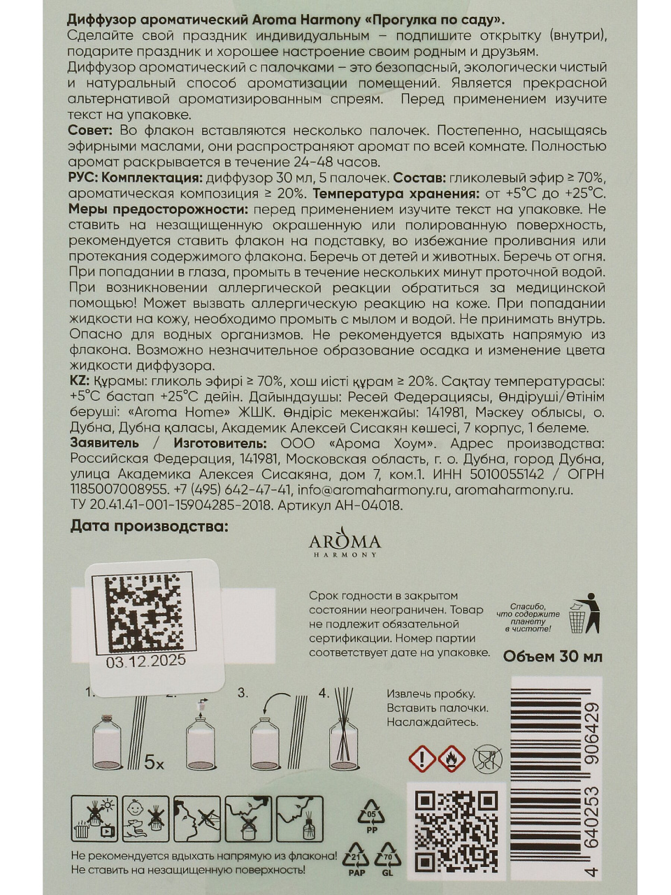 Объем — 30 мл, форма — жидкость, автоматический режим отсутствует, не требует запасных блоков. Производитель — Aroma Harmony, страна продавца — Россия.