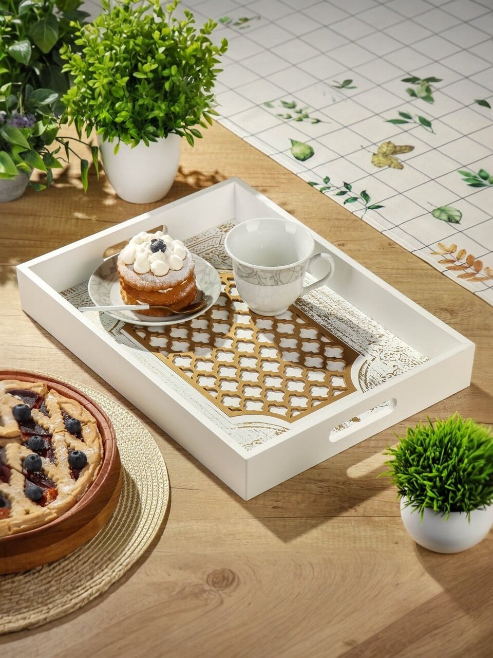 Стильный поднос Y4-8339 поднимет настроение Вам и Вашим гостям, подчеркнув изящную сервировку стола. А в близком семейном кругу он станет незаменимым аксессуаром для организации чаепития или легких закусок. С его помощью Вы легко можете побаловать себя и близких уютным завтраком в постель.