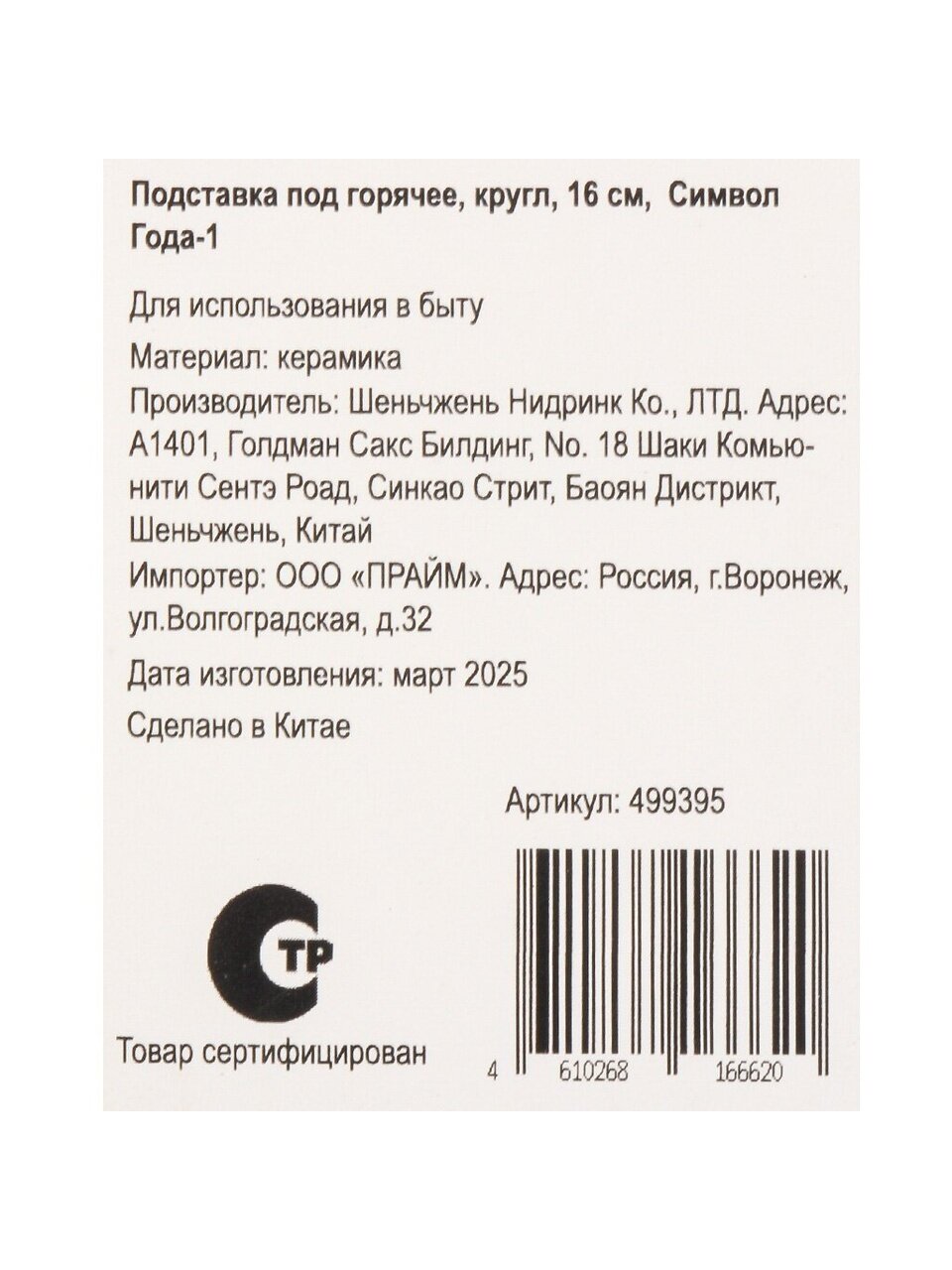 Подставка под горячее, керамика, круглая, 16 см, Daniks, Символ Года-1, Y4-9230